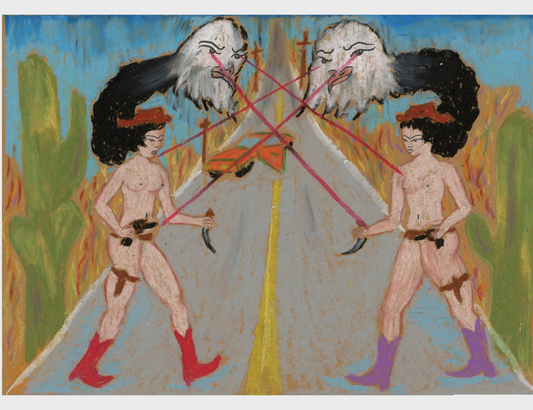 In Death Proof (2024), an orange car speeds by with three figures: one at the wheel or possibly checking her reflection in her compact; another lifting her shirt up to flash the viewer; a third topless body is draped languorously out of the car window until the viewer’s eyes follow the gouache strokes down to find two guns in her hands. In Duel (2025), perhaps a consequence to Death Proof, an eeriness and solemnity is brought to the queer Western. Two femme figures face off, naked except for red and purple cowboy boots and holsters around their thighs. Sprouting from their hair are eagles shooting lasers from their eyes to the guns to the human bodies.
