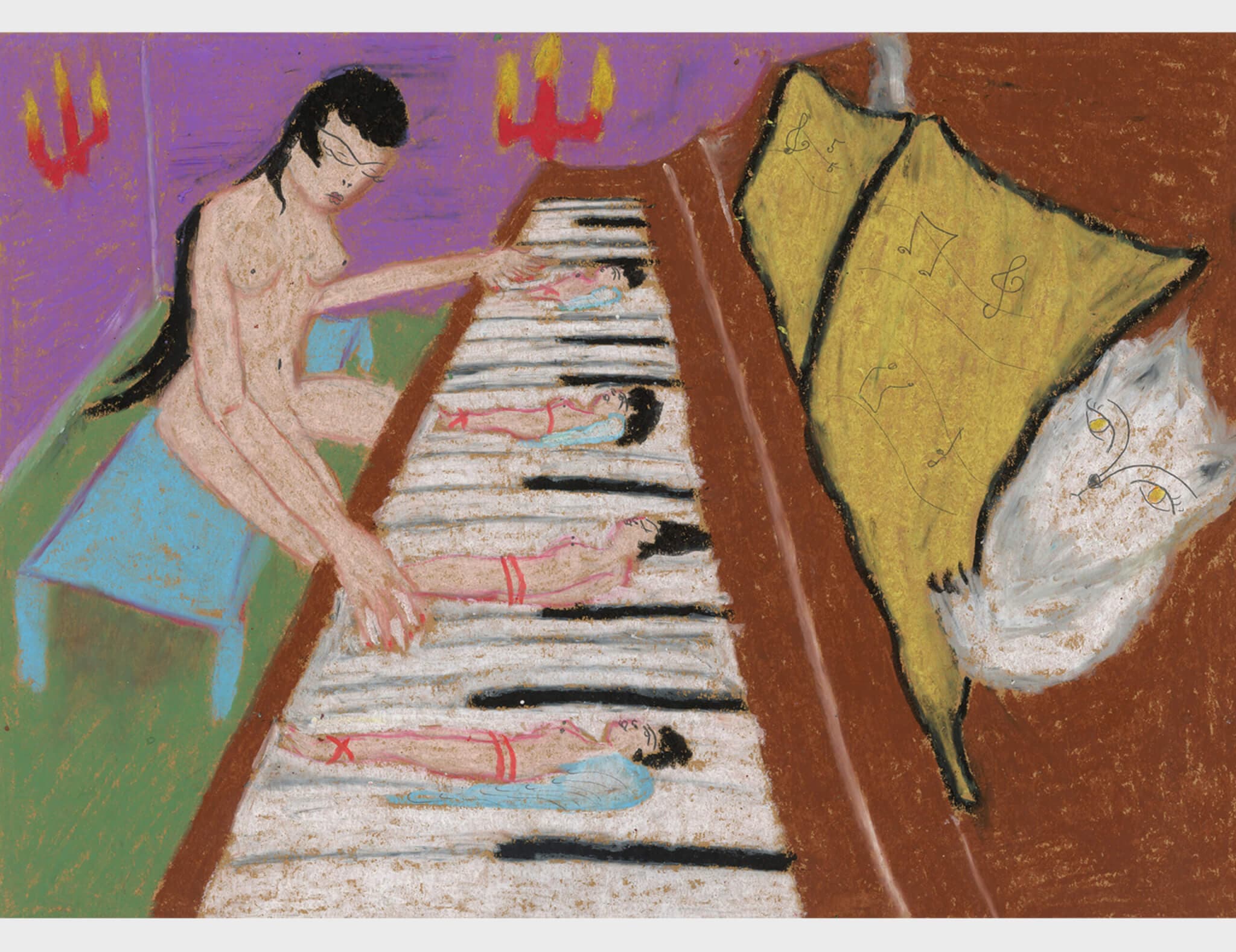 Affsoongar’s lyrical titles of her work on display at Pulp suggest a playfulness and narrative through line to connect the pieces. In Eeny Meeny Miny Moe (2025), a figure with long arms reaches toward a piano, the keys cradling rope-bound women. It’s like a nursery rhyme for adults; something nefarious could be lurking nearby, but it’s probably just the cat peeking out from behind the sheet music. The divine feminine energy overpowers any compromising position the artist places her subject in. The figures might be composed of two dimensional strokes but they are anything but flat or passive; they are luring us in.