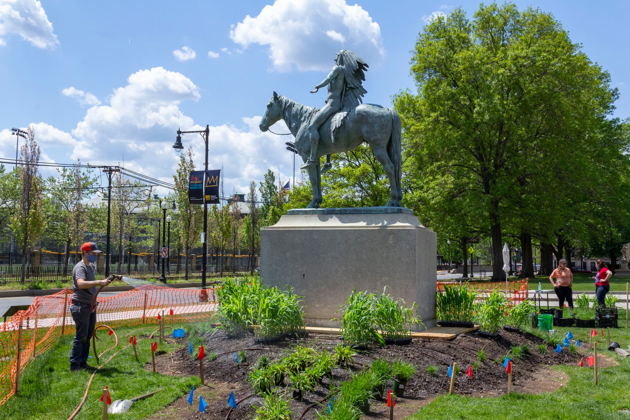 Elizabeth James-Perry and her team planted a Three Sisters garden around Cyrus Dallin’s Appeal to the Great Spirit for Raven Reshapes Boston: A Native Corn Garden. Photo ©  Museum of Fine Arts, Boston.