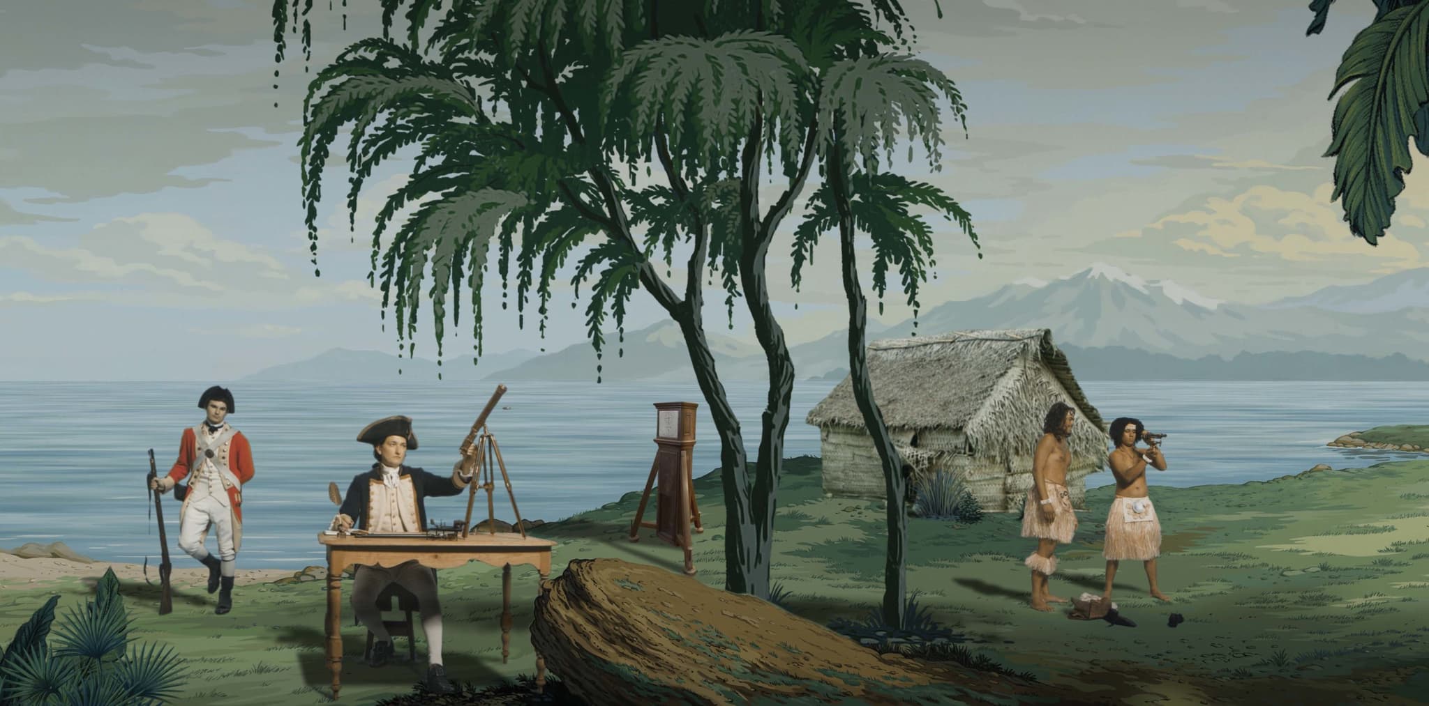 Catalogs of Reihana’s work describe the historical characters appearing in the video. There are warriors, brides, European astronomers, a Tahitian chief mourner, and British captain James Cook, who circled the world collecting objects and status. Perhaps to suggest the gender fluidity in some Polynesian cultures or the unclassifiable and larger-than-life aspects of Cook’s persona, Reihana cast Cook as both male and female. He’s played alternately by two different actors. His death and the events surrounding it are featured prominently. Before seeing the film, you might wonder why Reihana focuses so much on Cook, who she herself describes as “arguably the harbinger of colonization in the South Pacific.” In a 2015 interview, Reihana suggests that audiences trying to decipher the events of Cook’s life and death will gain insight into how Hawaiians and Europeans interpreted the same actions differently. She describes a difficult vignette following Cook’s death this way: “Cook’s tricorne hat and a thigh from his dismembered body are returned to [his] crew, who are offended and sickened. Pacific people may understand this differently: the thigh is a prestigious body part, and Cook’s hat is sacred due to its relationship to his head.”