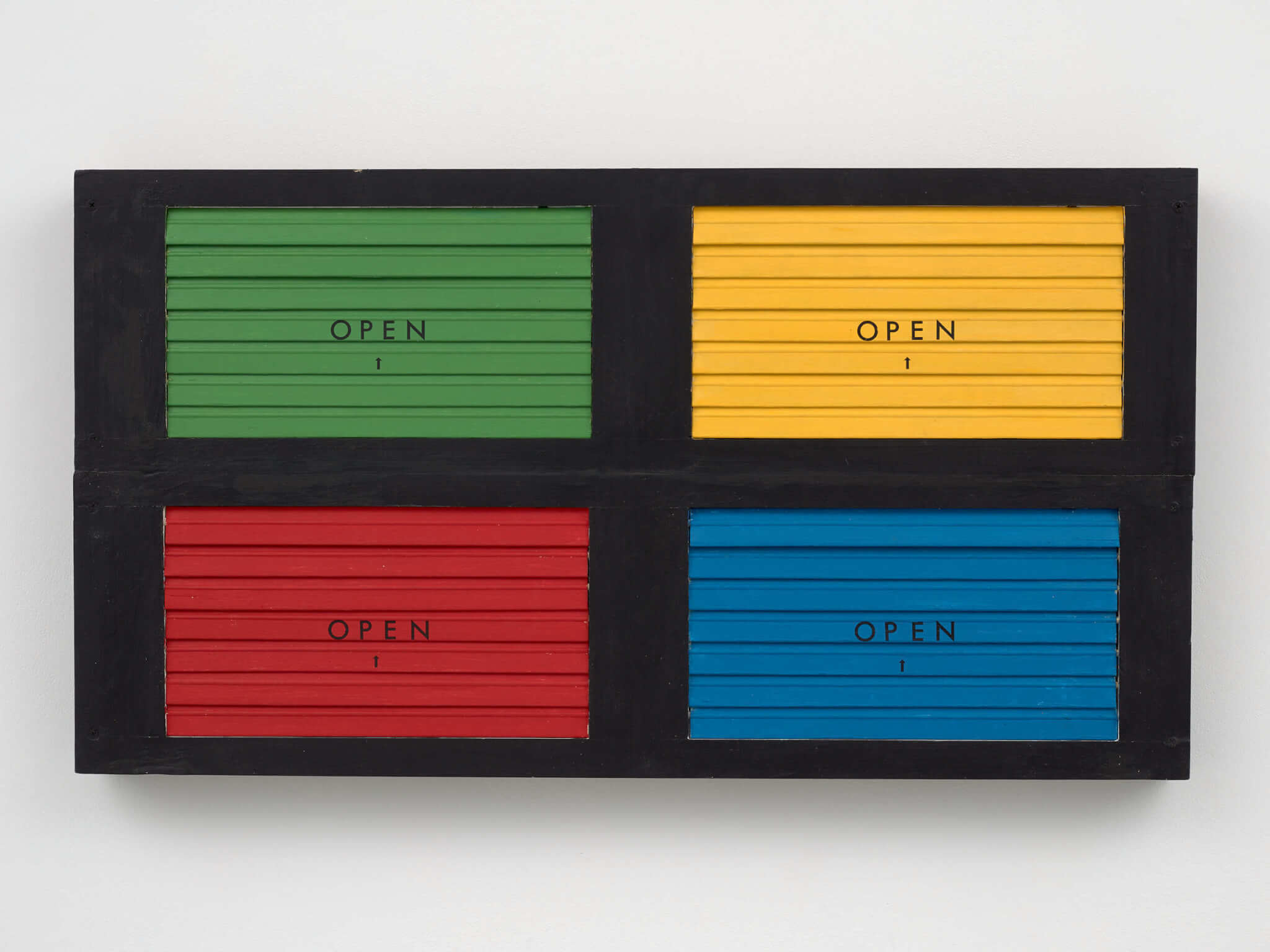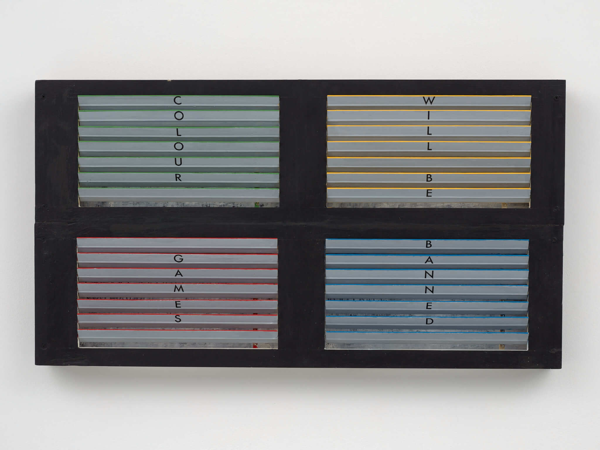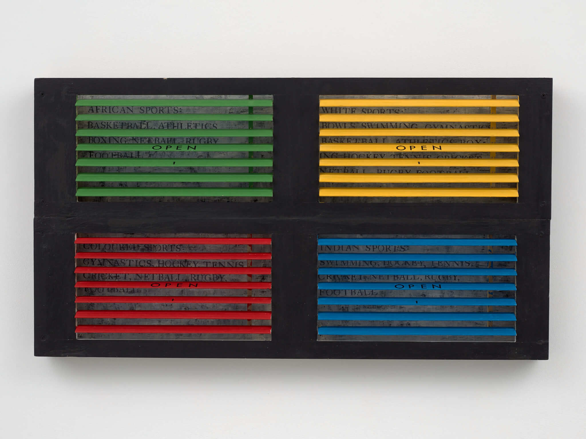 Organized by Jordan Carter, curator and codepartment head at Dia Art Foundation, the exhibition functions as a kind of mini retrospective where Green’s linguistic sensibilities and adopted modalities of color operate alongside participatory works as a form of travel. The hyper-chroma of Green’s installation in Dia’s north-south central corridor is underscored by meditations on the pervasive politics of color. The earliest work in the exhibition, Colour Games (1989), consists of four quadrants of wooden slats, painted green, yellow, red, and blue. Tilted forty-five degrees, like Venetian blinds, the slats allow viewers to barely decipher the text written across the quadrants: “Colour / games / will be / banned.” Behind the skewed slats is a black-and-white washed background that lists out “African Sports,” “White Sports,” “Coloured Sports,” and “Indian Sports.” The artwork was originally an interactive device with manual shutters, and participants could arbitrate between the bold hues, revealing and concealing racialized.