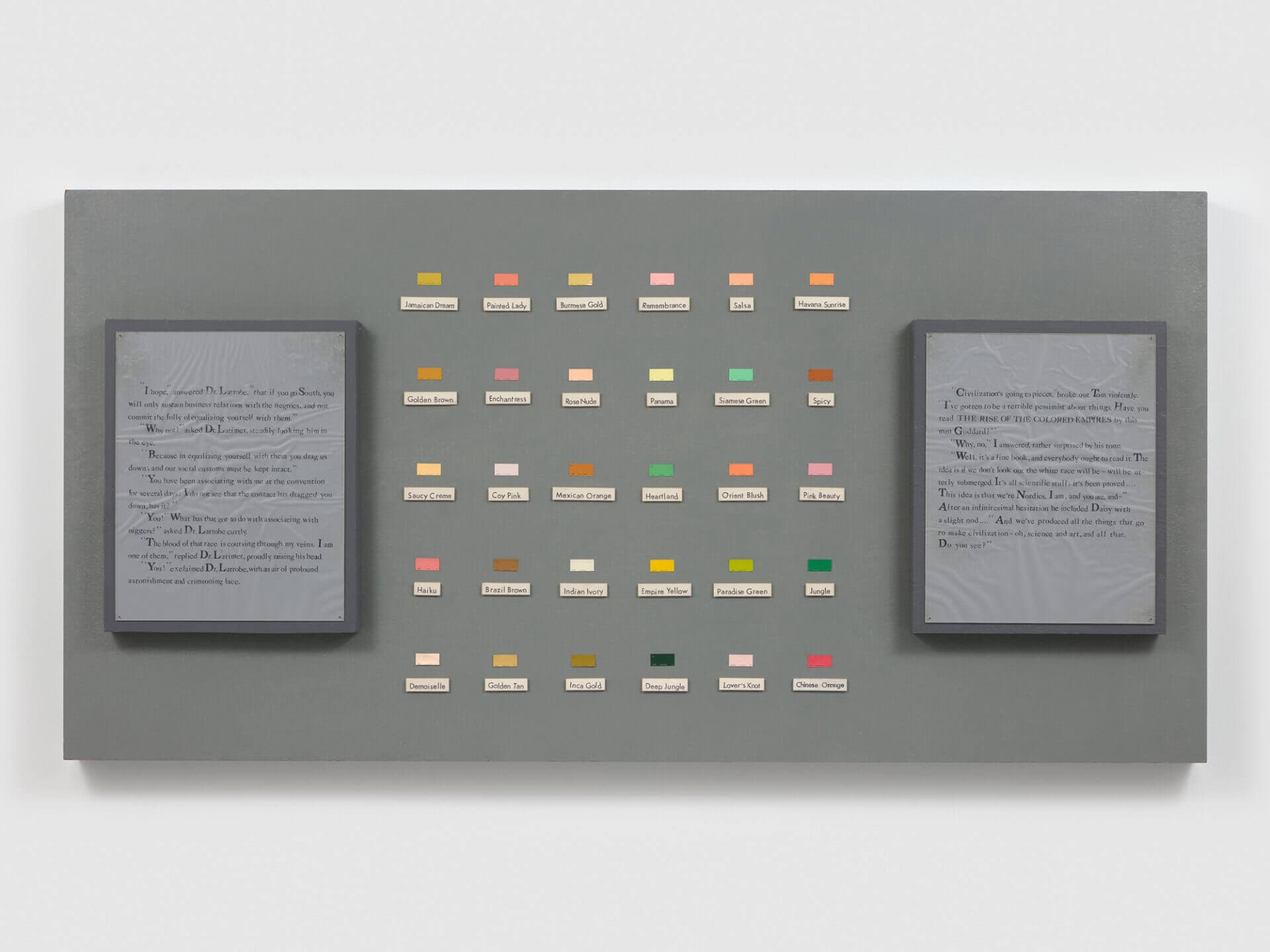 Green’s Color series (1990), on view in its entirety for the first time, also speaks to these reflections. Notably, Color I (1990) is a grid of paint swatches captioned with exoticized monikers such as “Mexican Orange” and “Indian Ivory.” The palettes are accompanied by pull quotes of character dialogue about racial injustice from the books Iola Leroy, or Shadows Uplifted (1892) by Frances E. W. Harper and The Great Gatsby (1925) by F. Scott Fitzgerald. The tagged samples serve as abridgements of these texts. Here, Green shines light on the parallel narrativizations of color and race. With color as the point of contact, she travels between formalism and considerations of identity and difference.1
