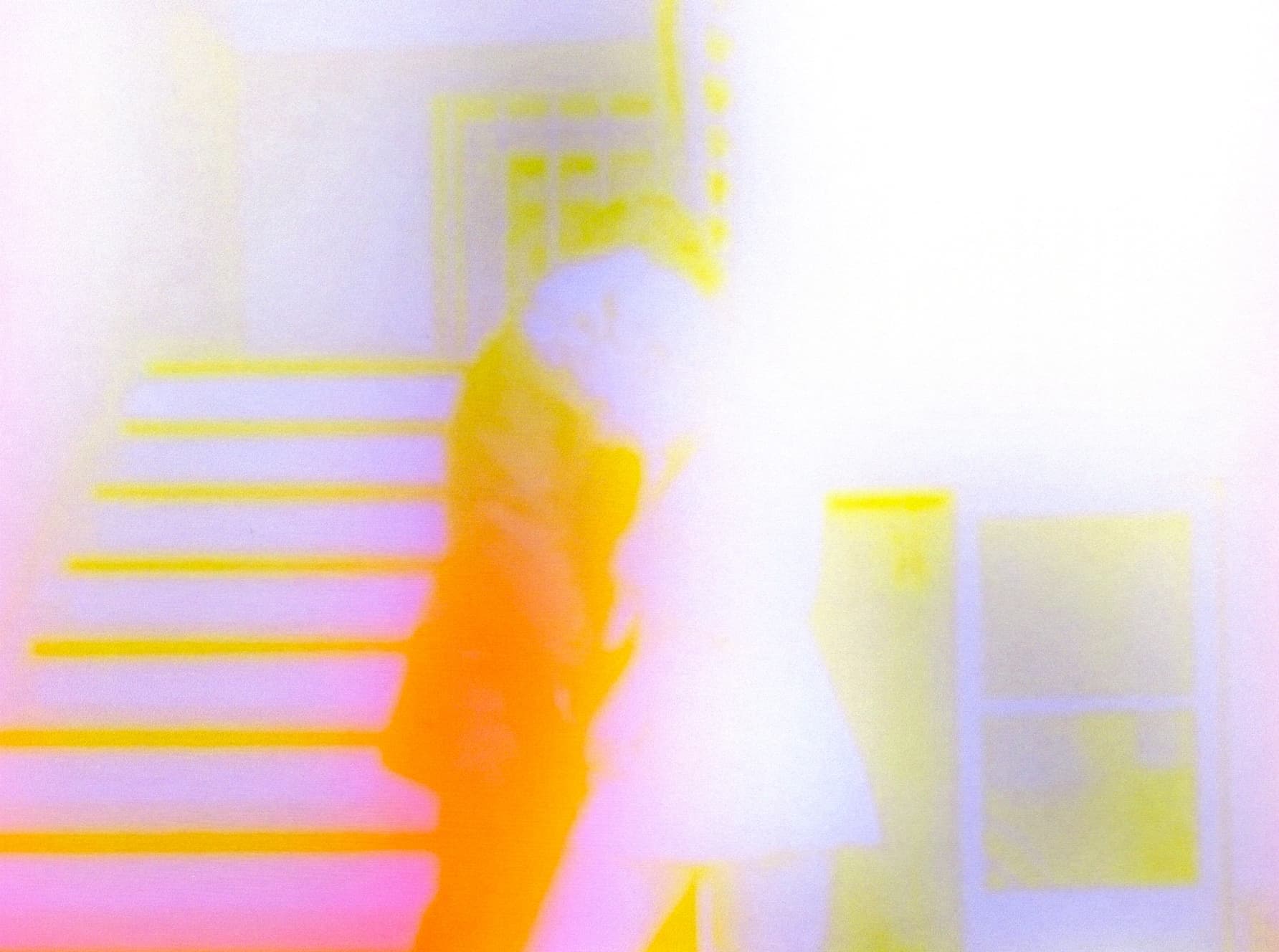 “Everything is Different” is one of the few colored films included in the exhibition. It is intimate in a way that feels cathartic for the exhibition. The video utilizes a still from “Katzelmacher,” another Fassbinder film, released in 1969 (8). The colors are altered, seemingly simultaneously saturated and faded. Pink, yellow, orange and lavender flash on the screen. The still is from a moment in the film when one character rests her head on her companion’s shoulder. The figures, indeed, are only distinguished from one another by contrasting colors; bright orange marks of the masculine form contrast the soft purple of the feminine. A doorway and window on the right illuminates the woman’s back, shrouding her in a bright, almost glowing white. There is a possible third person in the window behind them, but it is just as possible that it is an inanimate object. We know all too well that the brain seeks out human figures even where there are none. A staircase leads further in the interior of the space behind the man, and another doorway on the upper floor almost perfectly frames his head. His fluorescent head tilts down into the curl haloed head of his companion. Their bodies lean into each other, or appear to, in mutual trust. The forms are softest on their exterior, blurring into the surroundings.
