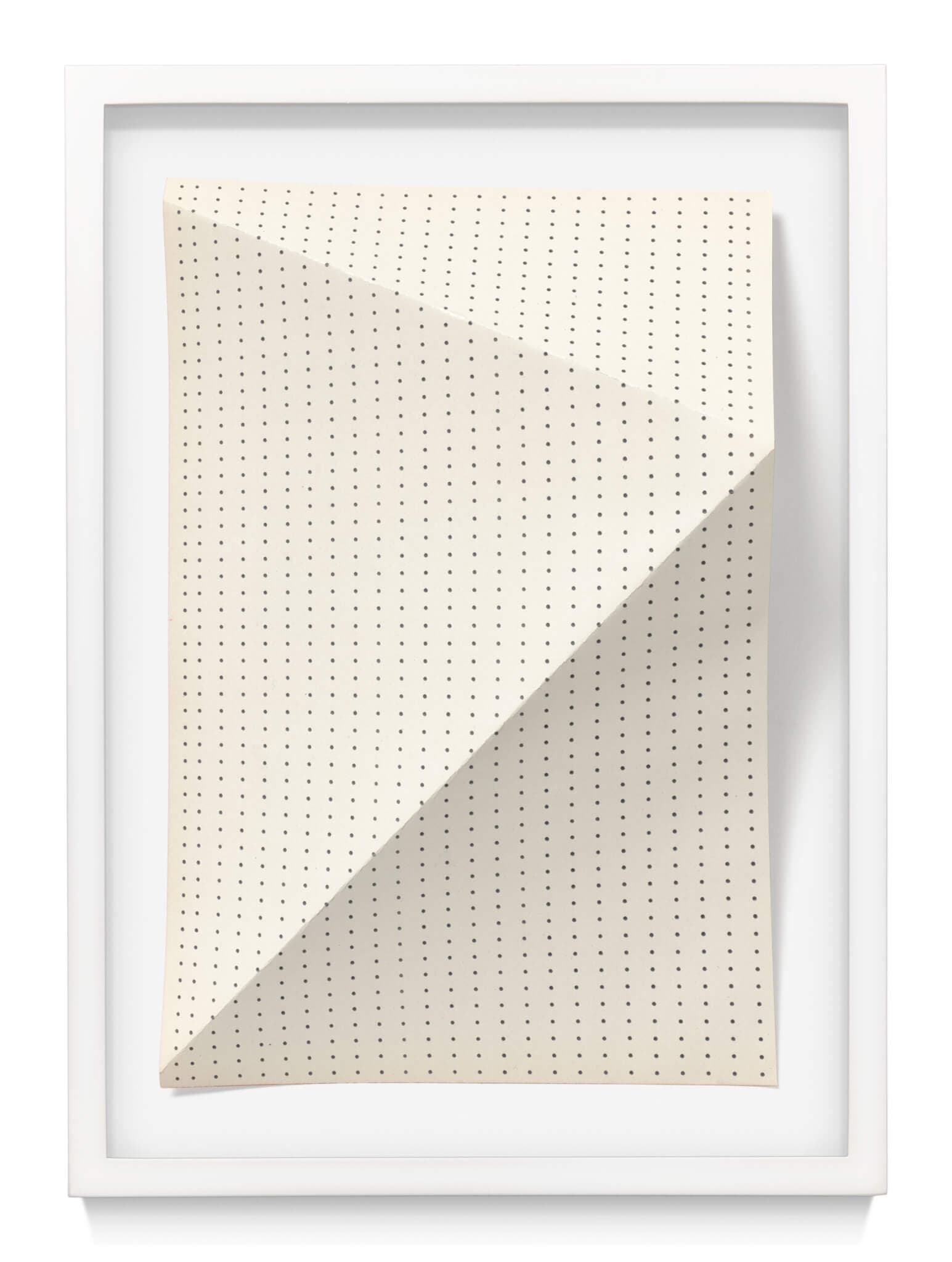 Suggesting movement, connection, and perhaps vibration, Vega (2024) is typographical and topographical. Typewritten periods—dots running almost edge to edge—make an expanse of ellipses. For the left half of the piece, Burge typed and then turned the paper on its side so that the dots appear to run vertically; on its right, she typed on a separate piece of paper and then attached it. The dots run horizontally. Diagonal folds from near the top-center to the bottom corners of Vega create a tent-like form. There’s a section without dots where an opening would be if this were a tent. A red-brown pencil line extends down the center of the piece. Before the line reaches the bottom of the page, it turns right. Although this work is abstract, its title refers to a grouping of three bright stars—Altair, Deneb, and Vega—known as the “Summer Triangle” because, easily visible during summer months in the Northern Hemisphere, they would form a triangle if connected by an imaginary dotted line.