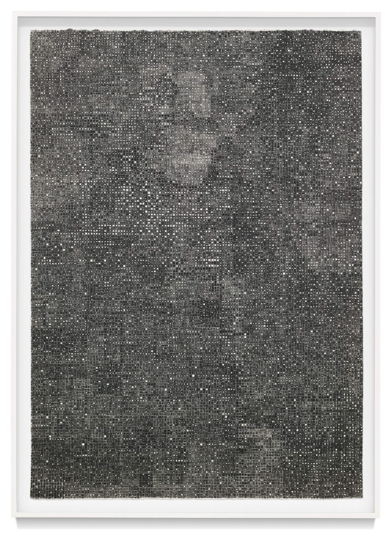 In Sterope (2024), a pattern of dashes forms a grid of squares. The margins at the top and left are uneven. Printed askew, the pattern—a device from another time, the kind of template that was well-used when more clothes were handmade—runs to the right edge and the bottom of the 8 ¾ x 5 ⅞ inch page. With a pencil, Burge filled about half of the squares with neat circles such that a loose and wavy chevron pattern emerges when viewers stand back from the work. Across the gallery and about five times larger than Sterope, Star Data II (2024) is a tight and extensive variegated gray-black network of small boxes without any evident overall pattern. It could suggest skyscrapers in a dense cityscape or an earnest researcher’s attempt to impose a grid on the night sky. As Burge noted, “Both astronomers and weavers use grids to organize their information.” And, grids are abundant in the show at Krakow Witkin. For Electra (2024), Burge cut one apart and reconfigured it out of sync, the pieces at off angles like sections adrift—parts without the benefit of gravity to keep them attached. She started Star Data after considering réseau plates at Harvard, which use grid marks that help facilitate astronomical measurements. Points of negative space in her drawing refer to stars. “The grid works here as a reliable marker of magnification, focus, distance, and orientation,” Burge told me during a later conversation on Zoom. “I think of the grid as a finding tool, a guide, an infrastructure where organization or disorganization can take shape.”