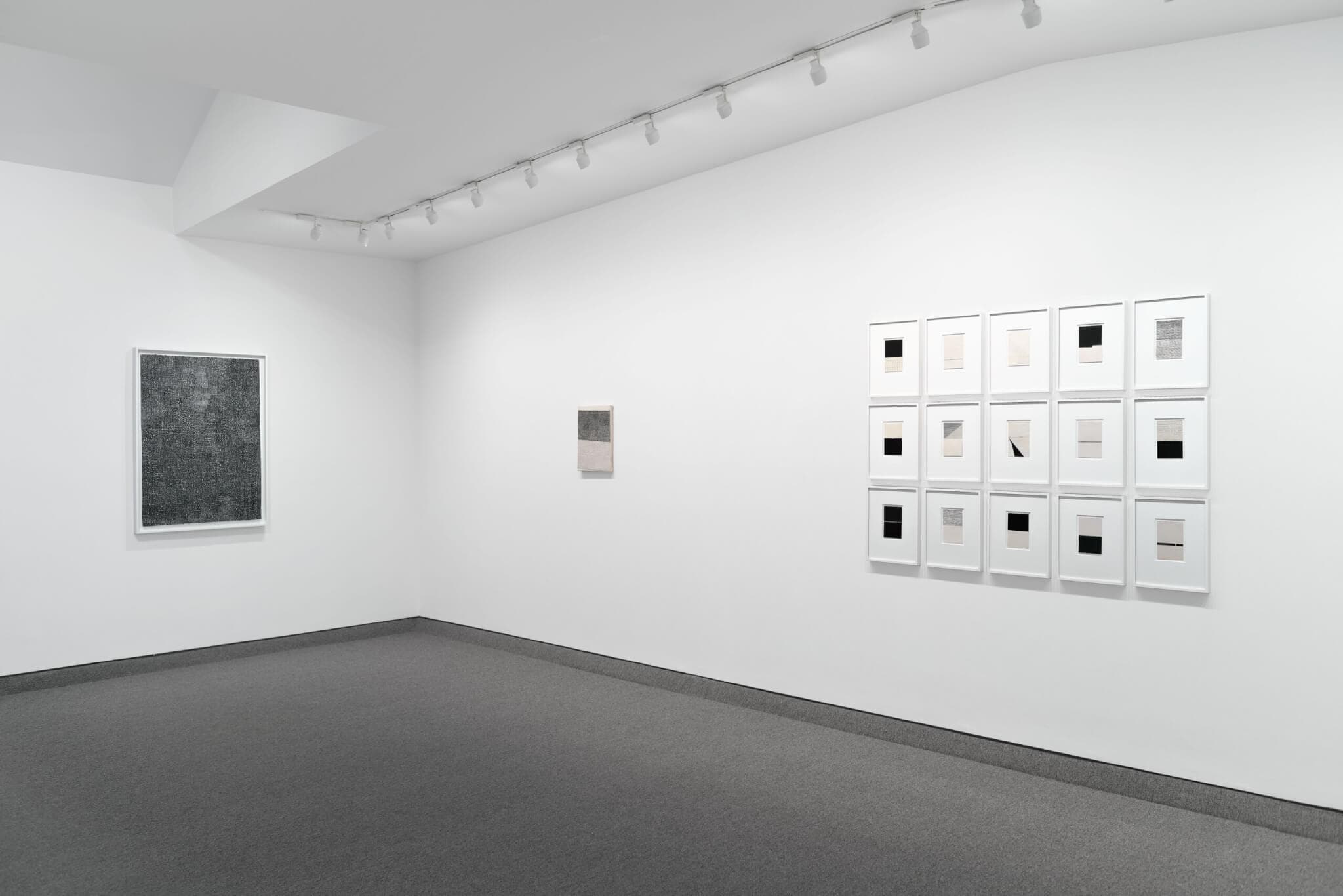 “An inevitable element of delight when working within archives and libraries is discovering an unexpected three-dimensional object within the pages of a book,” Burge explained. “These artifacts—often folded papers haphazardly tucked into the back of a notebook, stuffed between pages, or quickly tipped in with whatever sticky substance was at hand, deeply flattened from time and pressure, and usually, if particularly lucky, containing a sketch, symbol, sentence, or code—create a moment of intimate connection with the long-ago author.” Burge’s Landscapes & Atmospheres (2024), a grid of fifteen minimalist pieces featured centrally on the gallery’s main wall, suggests these kinds of finds. One resembles compressed origami, another a message in Braille, another a plan for wonky steps leading to a void.