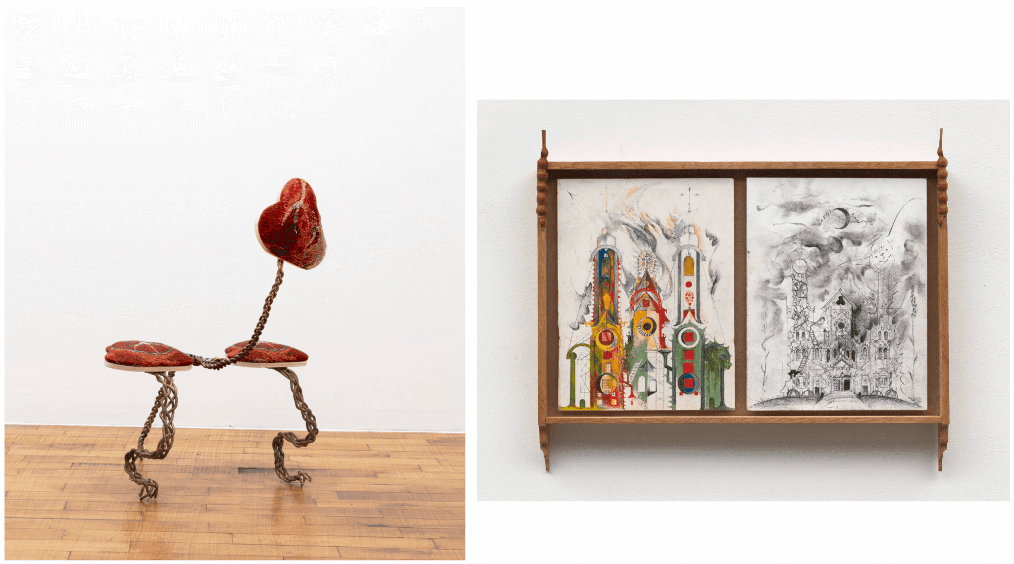 (left) Brittni Ann Harvey, Weeping Willow Angel (Robot Dog on Hind Legs), 2021. Polyester on jacquard-woven fabric, plywood, polyfill, bronze. 19 × 30 × 18 in. Courtesy the artist and Someday, New York. (right) Harry Gould Harvey IV, Presupposition of Saint Anne, 2023. Colored pencil, charcoal, xerox, white oak from Prudence Island. 19½ x 16 x 2¼ in. Courtesy the artist, KADIST Collection.