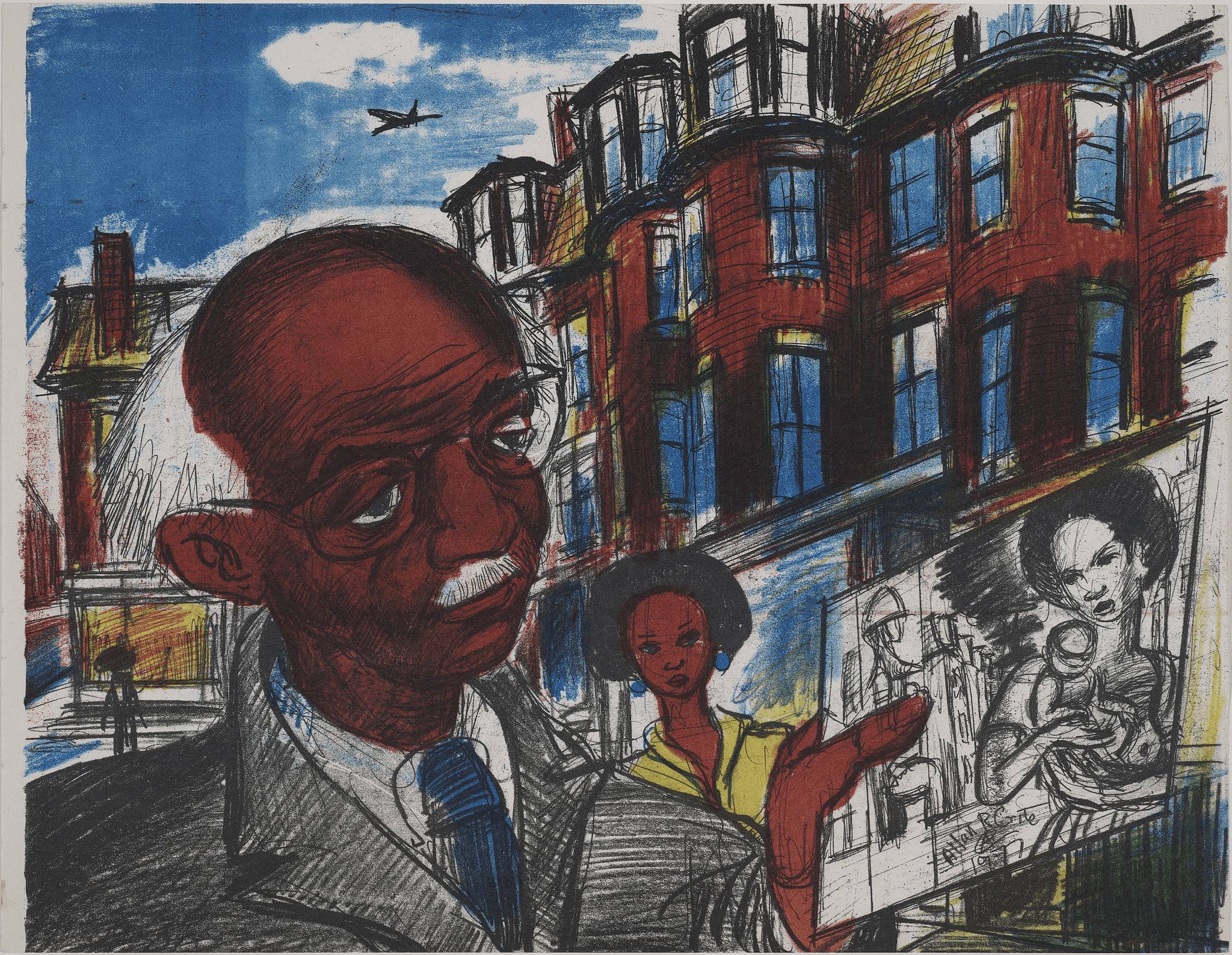 Allan Rohan Crite (American, 1910–2007), 410 Columbus Avenue (from An Artist’s Sketchbook of the South End: A Walking Tour about Black People), 1977. Offset color lithograph. Museum of Fine Arts, Boston. The Living New England Artist Purchase Fund, created by The Stephen and Sybil Stone Foundation. Courtesy of the Allan Rohan Crite Research Institute and Library. Photograph © 2025 Museum of Fine Arts, Boston.