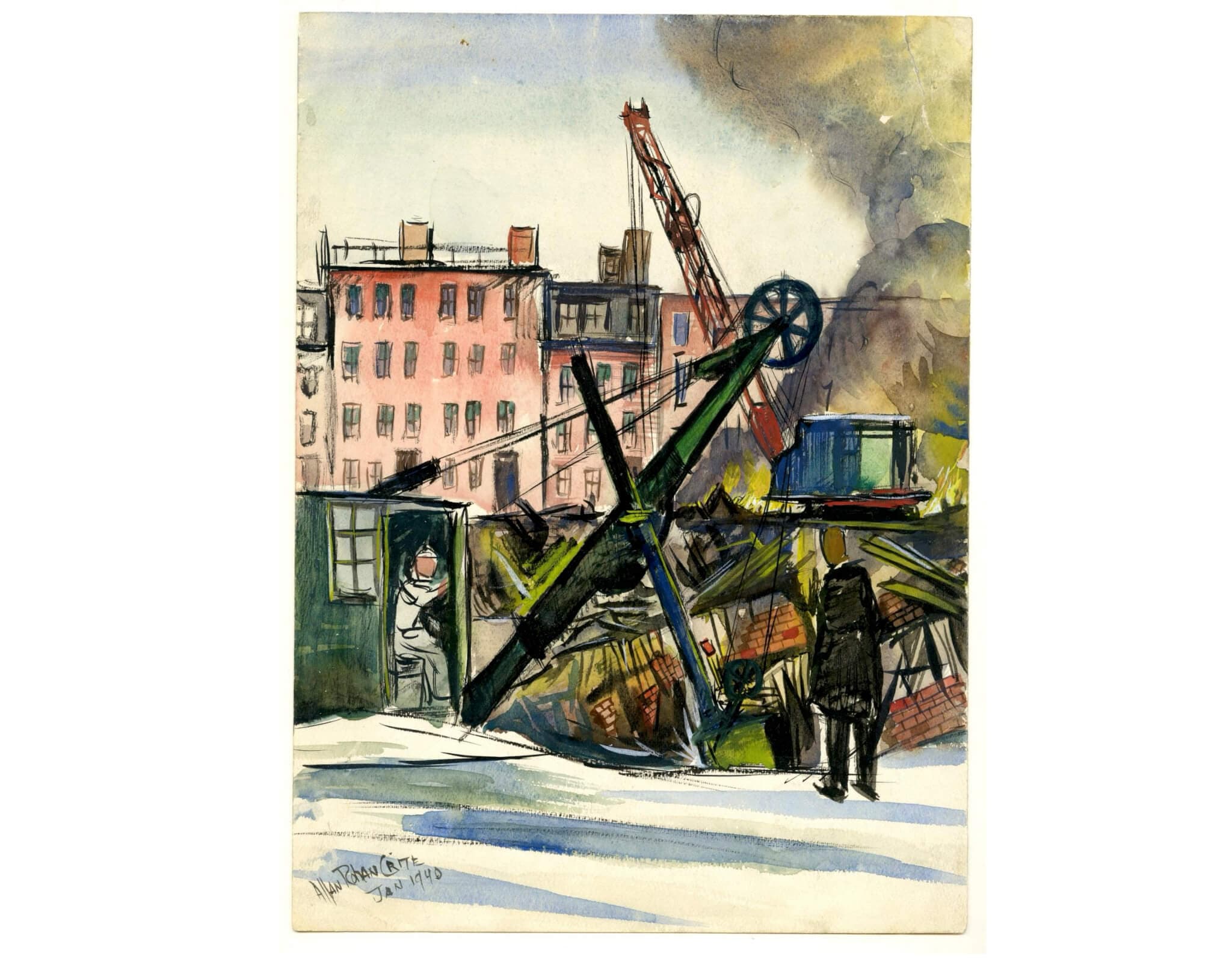 Allan Rohan Crite (American, 1910–2007), Burning and Digging: South End Housing Project, January 1940. Watercolor with ink and white highlights. Boston Athenaeum, Gift of the artist, 1971. Courtesy of the Allan Rohan Crite Research Institute and Library.