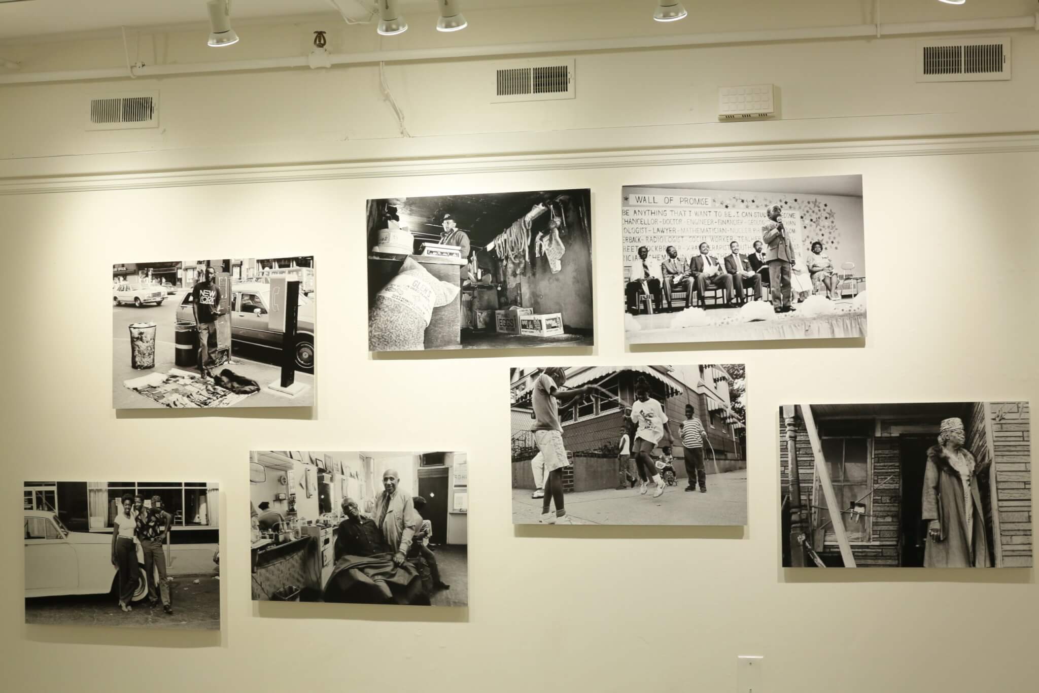 This intergenerational binding is conveyed in Wall of Promise. In this 20″ x 30″ photograph, seven adults sit on a stage in a New York City public school, the men in suits adorned with boutonnières on the left and the women in dresses and pearls on the right, before a large block of text—the “Wall of Promise”—behind them. The text, written in first person, pledges that one can study and become anything that they want to be, listing careers from chancellor, doctor, engineer, to lawyer, mathematician, radiologist, and social worker. A lone little boy stands tall downstage with a large microphone in hand, seemingly making a declaration to the audience. The photograph signals the dedication of Black elders to encouraging and supporting Black futures. This theme is central to photographs created by Miller, who affirms that “the history of hundreds of years of enslavement, Jim Crow, and existing racist systems, [that] have not thwarted our efforts to flourish magnificently.”