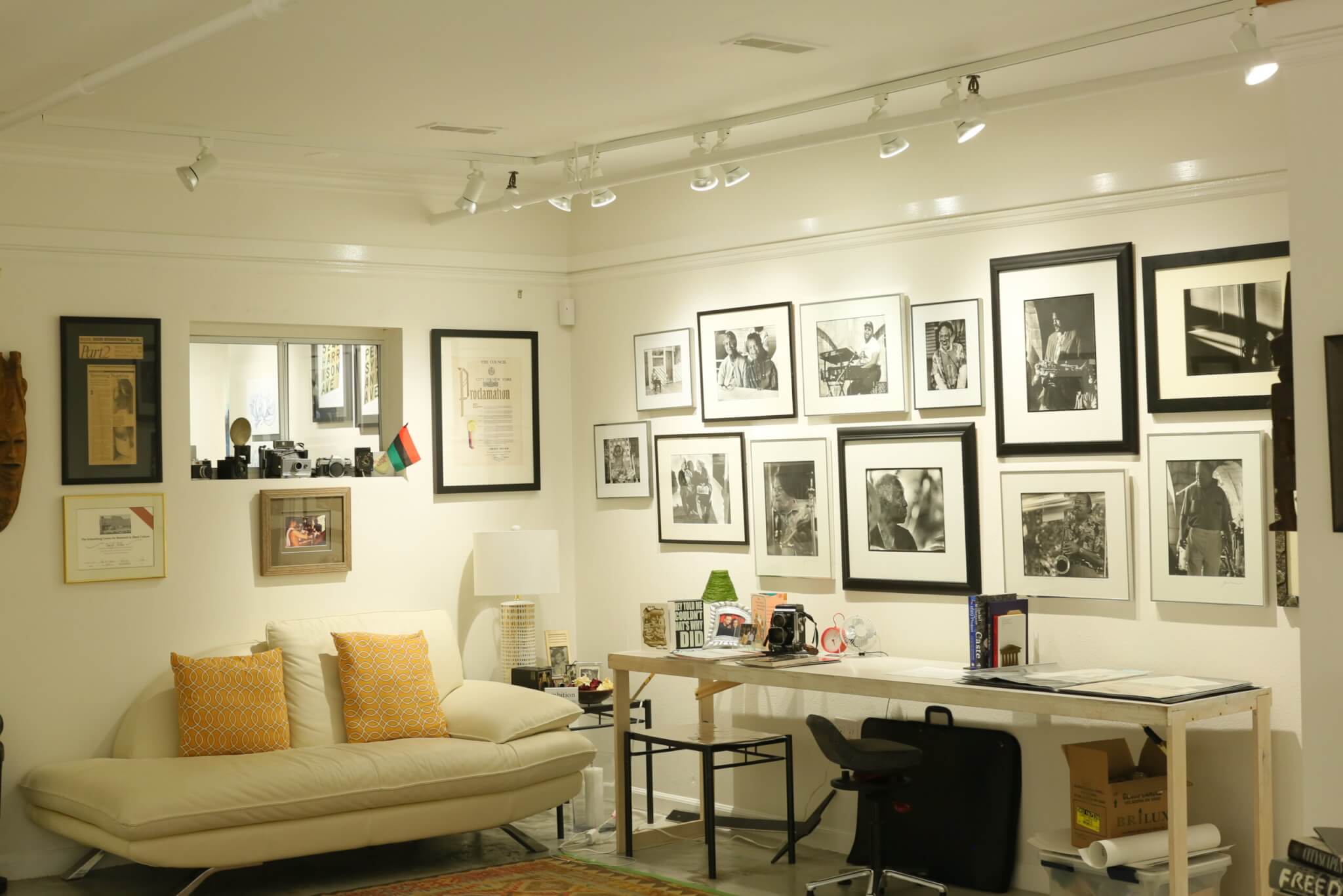 “You’re my angel,” sang Lalah Hathaway as I walked down the steps into Beacon Gallery in Boston’s South End to visit “Cheryl Miller: If We Stand Tall.” It felt familiar; it simply felt right to have incense burning and be surrounded by art and family photographs. I entered the gallery during one of three Studio Sundays held throughout the month of August, which welcomed the public into the space of Miller’s artist residency. Inside, large unframed prints hung on one side of the elongated gallery. On the other, framed photographs of different sizes hung above a desk and small table that displayed family portraits, books, vintage cameras, a bowl of dried flowers, memorabilia, and other curios.