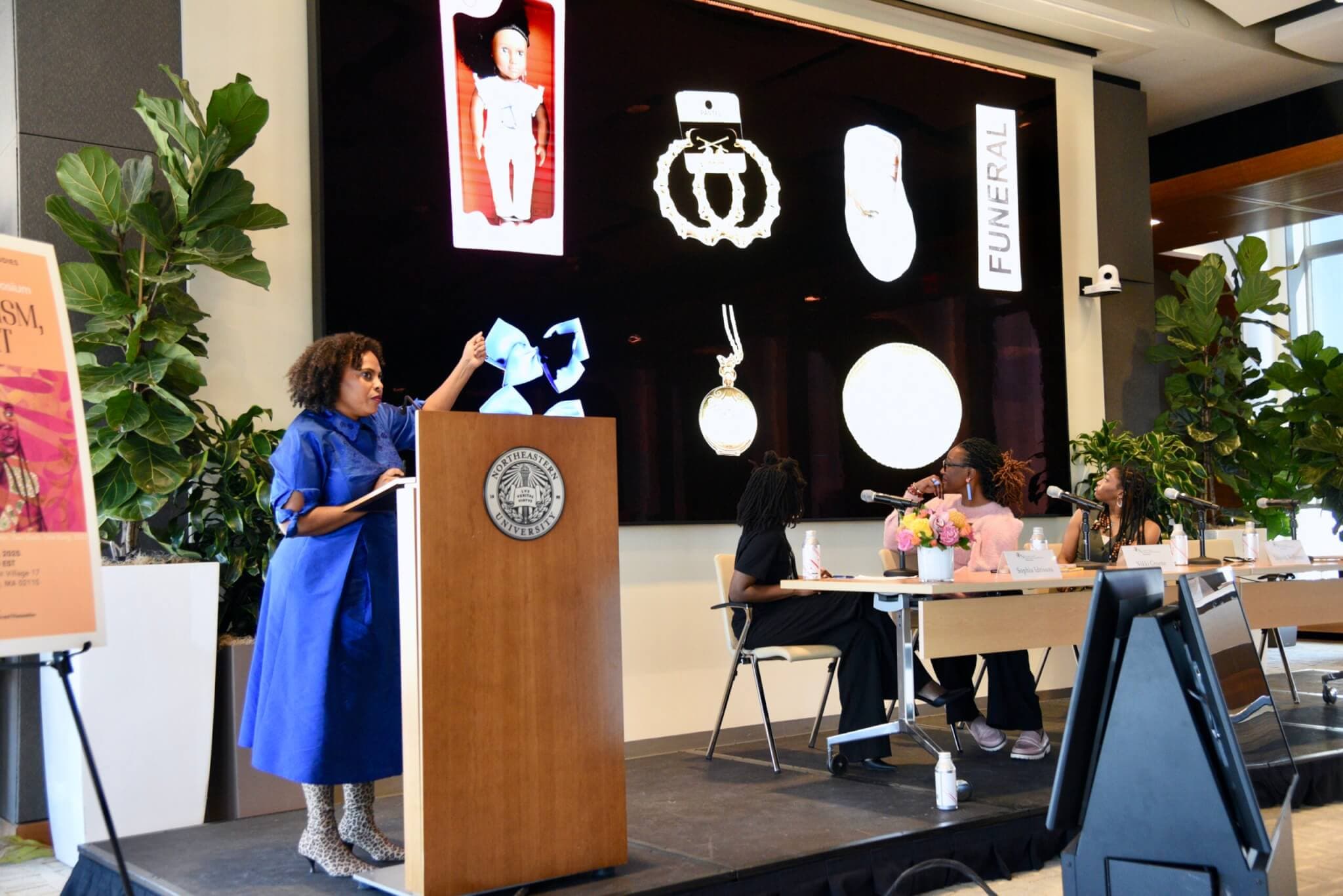 Scheherazade Tillet presents during a panel discussion titled “Art Moves Us.” Photo by Vania J. Arroyo. Courtesy of Northeastern University.
