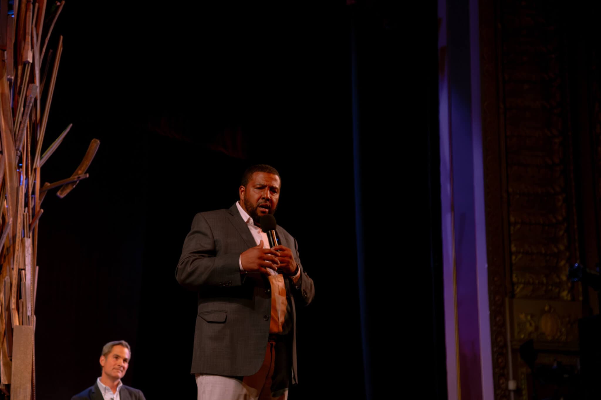 Massachusetts’ inaugural poet laureate, Regie Gibson, delivered a spoken word performance at the mayoral forum, July 30, 2025. Photo by Marianna McMurdock.