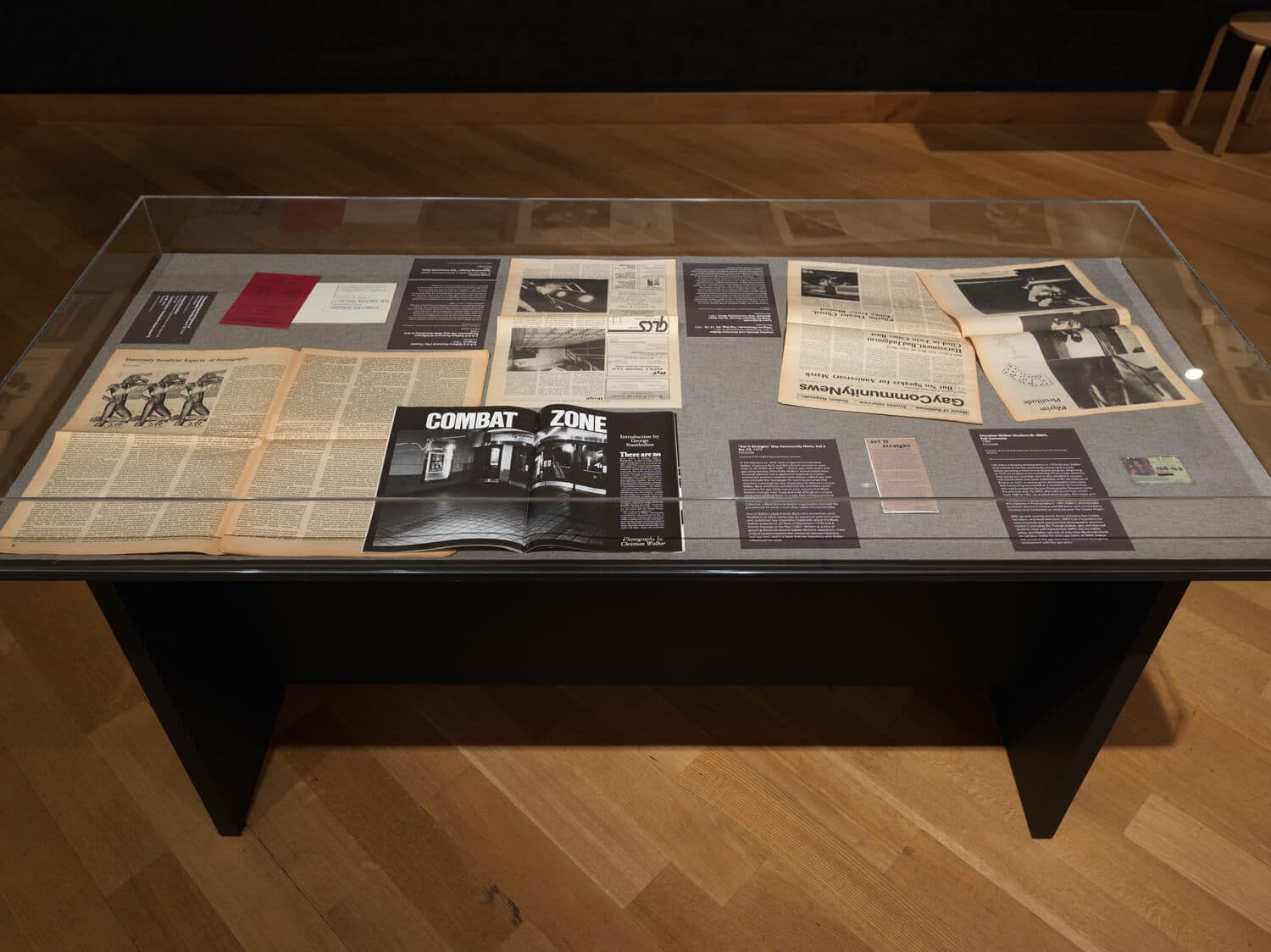 Throughout the exhibition are photographs of Walker taken by friends—his collector Roger Bakeman, the Georgia-based artist and academic V. Elizabeth Turk, and Bill Burke, an important and supportive teacher for Walker, Goldin, and others at the Museum School. There are also museum cases chock-full of historical ephemera. One case holds a 1975 letter co-signed by Walker in Boston’s Gay Community News decrying racism in the community. In another case, there’s a 1990 interview Walker conducted with the artist Andres Serrano for Art Papers. Serrano, attacked for using bodily fluids and religious subject matter, stated his aversion to what he called homogenized, non-threatening art. Nearby, there’s material associated with a 1990 exhibition Walker co-curated in Atlanta titled “Against the Tide: The Homoerotic Image in the Age of Censorship and AIDS.” There’s also Junkies Don’t Care About Bleach, Walker’s 1989 work made in collaboration with a person identified as Bobby who wrote about how he was trying to think more about who he shared needles with and took as sexual partners.