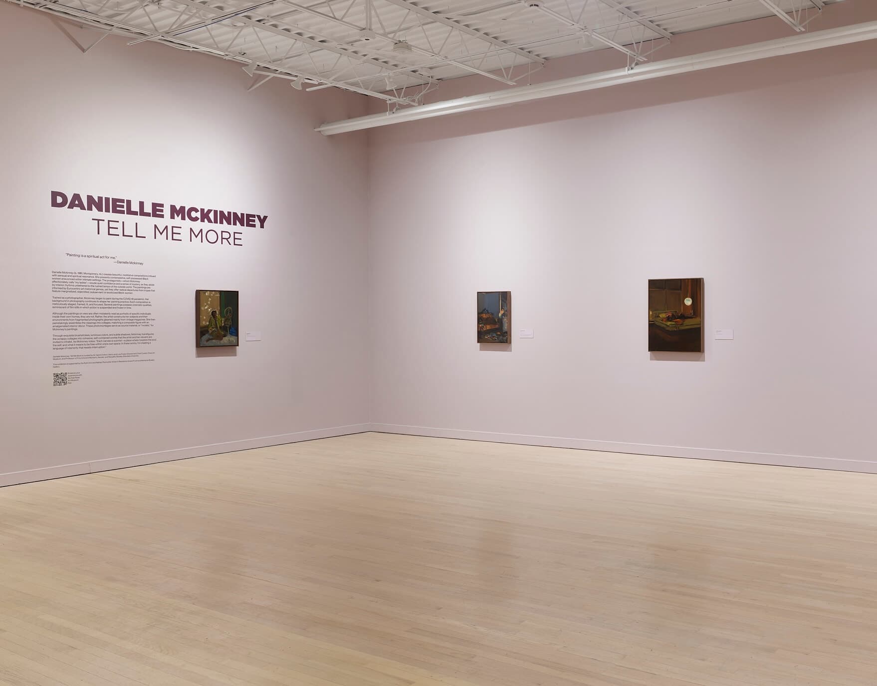 When painter Danielle Joy Mckinney explained to me the power in her painting, she spoke about the artist’s responsibility to be empathetic to what they witness and to formalize it in a way other people can then understand. Interpreting Mckinney as such a witness and her work as testimony, it is only fitting that her show at the Rose is titled “Tell Me More.”