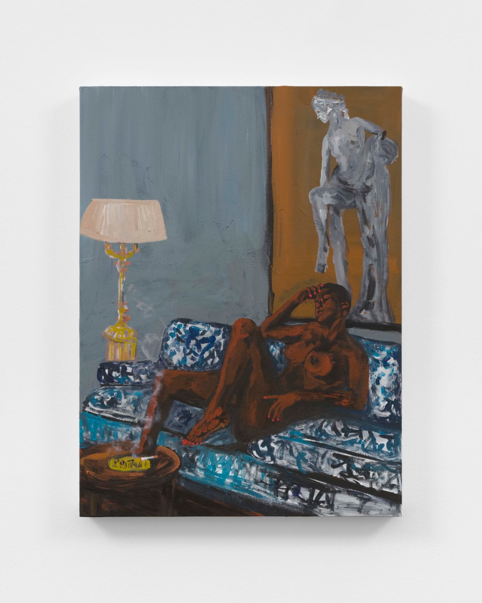 DJM: I’m really thankful Thelma put that into words for me. I felt it myself. I’d look at the women and see them so vulnerable, nude, sprawled out in these introspective moments and think, Damn, I wouldn’t want someone to see me like that. But they allow the viewer to experience that vulnerability. What’s beautiful about the medium of painting is that it allows you to project into its narrative.