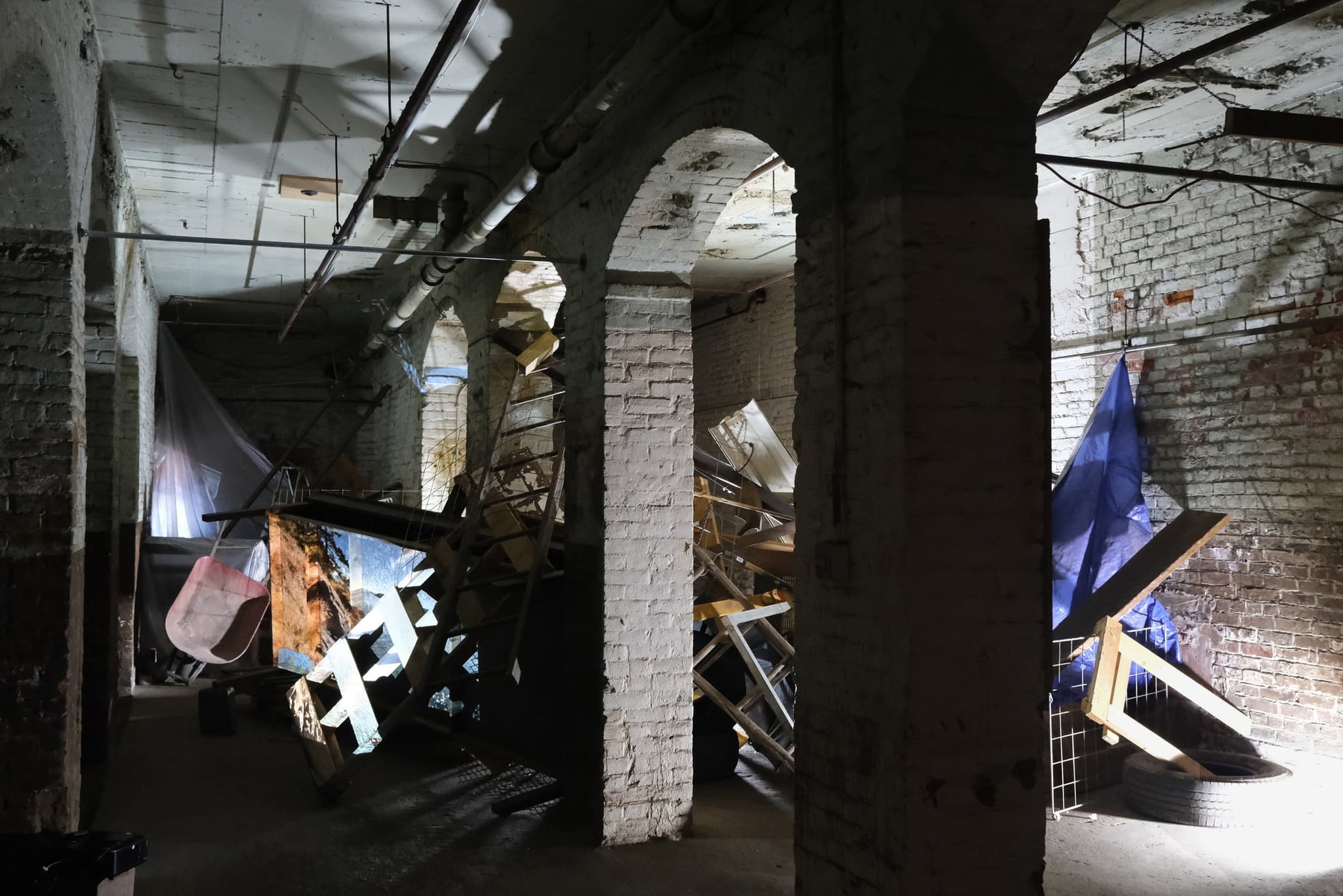 Tania Colette B, “New Henge,” dual installation as part of residency at lower_cavity (2021). Brick, salvaged household and construction materials; dimensions variable. Image courtesy of lower_cavity.