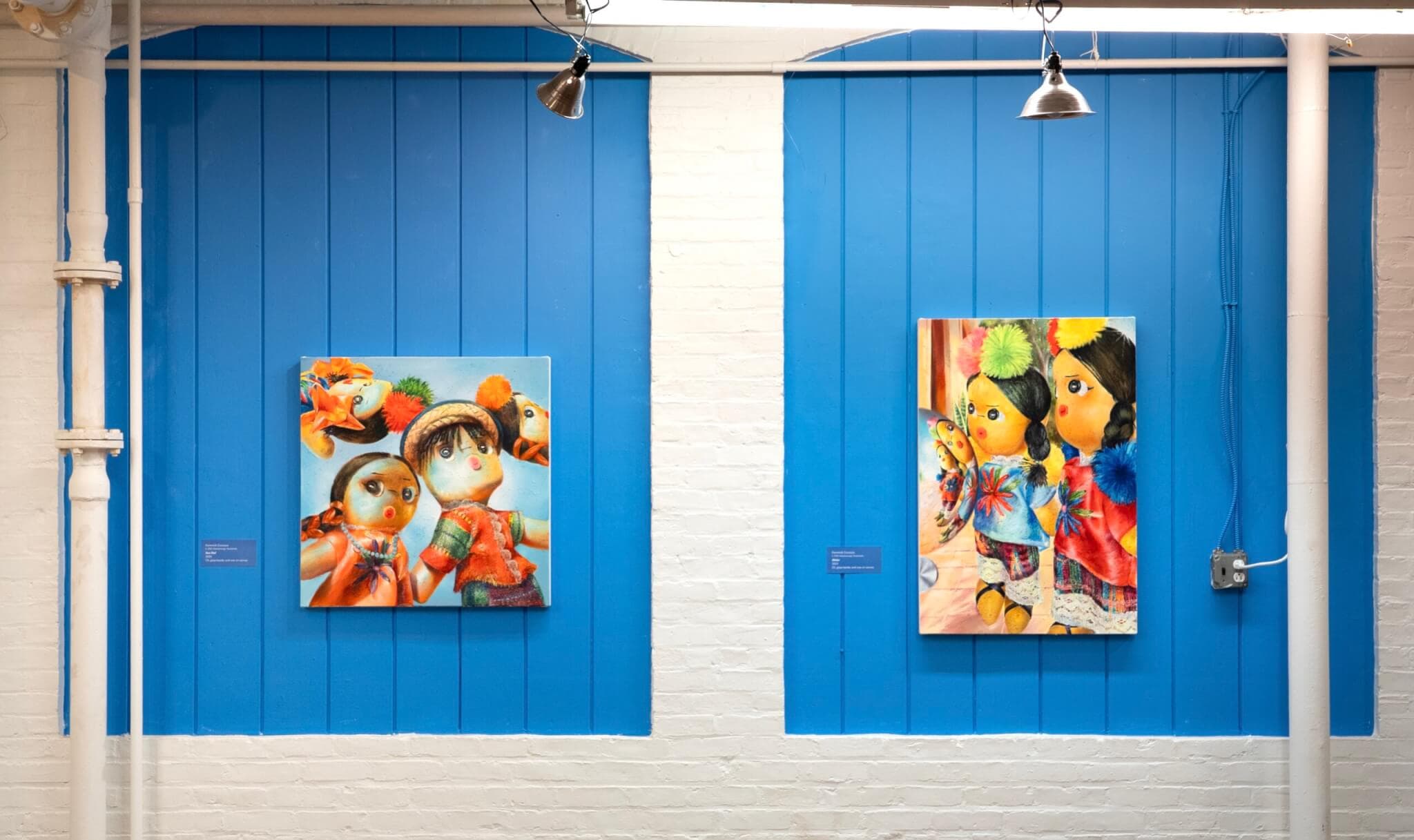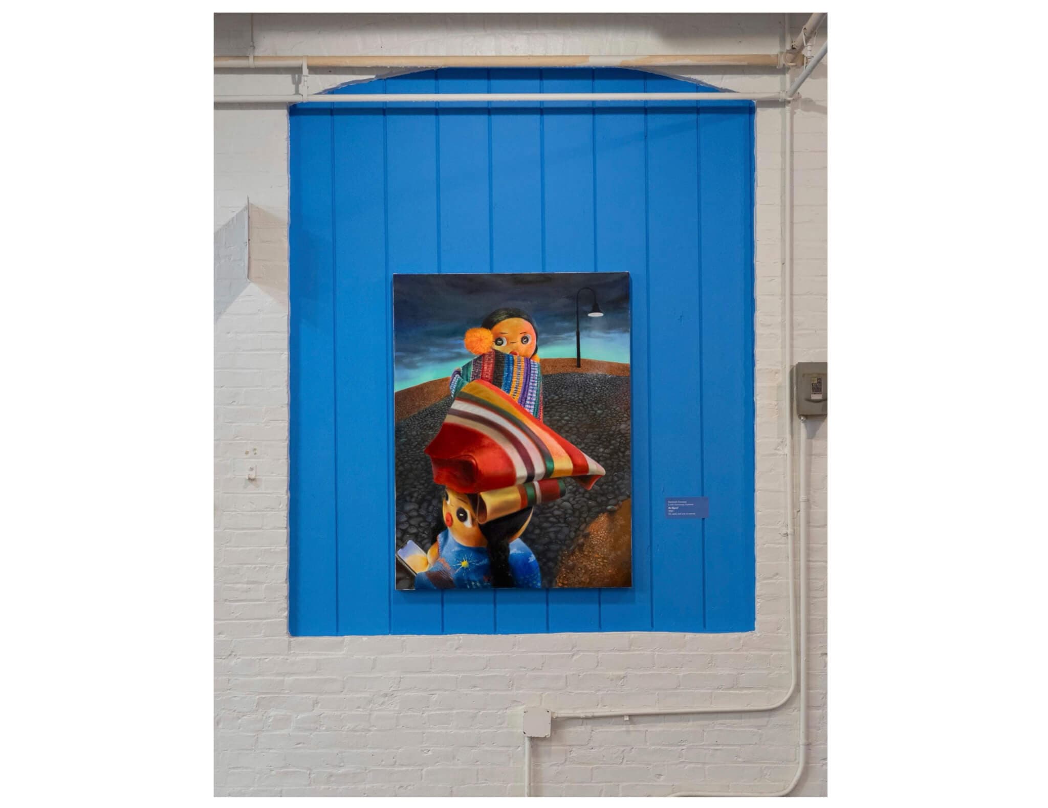 Several of the most intriguing paintings in the exhibition disorder proportion, scale, and perspective to illustrate the more-than-human qualities of these soft figures. In my favorite work, titled No Signal (2025), two girl-dolls stand at odd angles to one another on a desolate cobblestone street; one street lamp illuminates their path, the only other light source emanating from the glowing screen of a cell phone opened to its front-facing camera that one doll inexplicably holds. The face of this doll in the foreground is in soft focus, contrasting with the almost hyper-detailed cobblestones and rocks above and behind her and her companion. The two dolls exist on a strangely flattened and foreshortened picture plane mimicking that of a high-definition iPhone photo—a cheeky reminder for viewers to recognize both Indigenous and mestizo Guatemalans at home and abroad as fully in control of their own representations. Hung nearby is another standout, Globe (2025), in which one doll’s figure expands to fill nearly the entire canvas, her face and body multiplied across mirrors that consecutively focus and zoom closer into her face. This doll almost leaps off of the canvas, and her three-dimensionality is emphasized with the glass beads that Cocozza has embedded beneath layers of paint, creating textures that may refer to the gravel and concrete of city streets or rural paths. As she looks at herself in these endless mirrors, the doll’s blank eyes and pursed lips make me consider: How does she feel about her many reflections? Furthermore, I wonder if any of these larger-than-life dolls are still pretending to solely be inanimate objects designed for the comfort or play of their (human) owners, or have by now fully refused being possessed by others to become beings in their own right? The same questions might be asked of transnational adoptees and other Latine migrants who have been (and continue to be) forcibly displaced, and which will remain with me long after this tender and vibrant presentation of “Me acuerdo (I Remember)” closes on November 6.