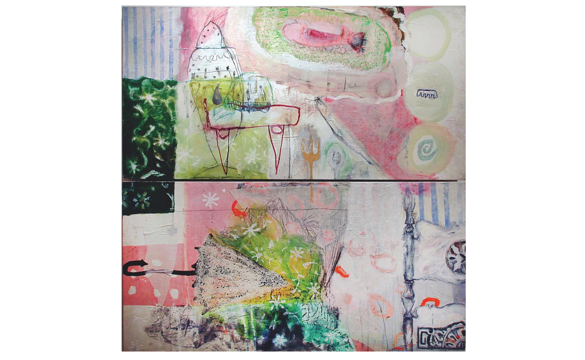 Donnamaria Bruton, Personalities are Portable, 1995. Acrylic on board, stacked diptych, 48 x 48 inches. Courtesy of the Estate of Donnamaria Bruton and Cade Tompkins Projects.