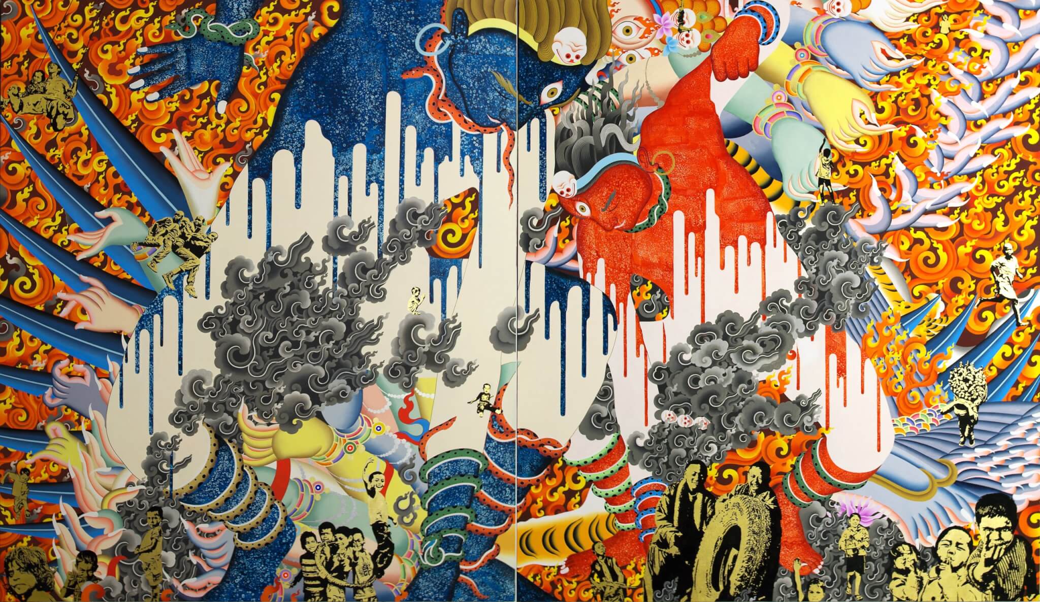 Tsherin Sherpa (American, born Nepal, 1968), All Things Considered, 2014. Pale gold leaf, acrylic, and ink on cotton. Elaine W. Ng and Fabio Rossi Collection.