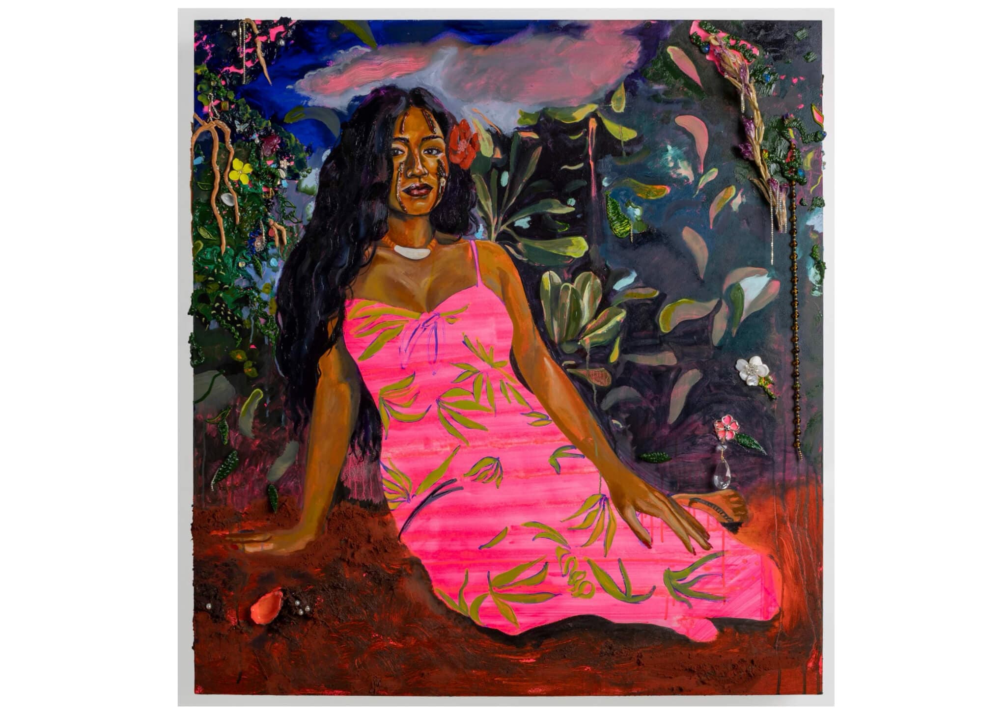 Gisela McDaniel, Prima, Nieta, Nåna: Pasifika Bailadora, 2021. Oil, found objects, flower in resin, epoxy on canvas; associated audio recording, 45 x 32 x 6 inches. Collection of Jacky and Gina Aizenman. © Gisela McDaniel. Courtesy of the artist and Pilar Corrias, London.