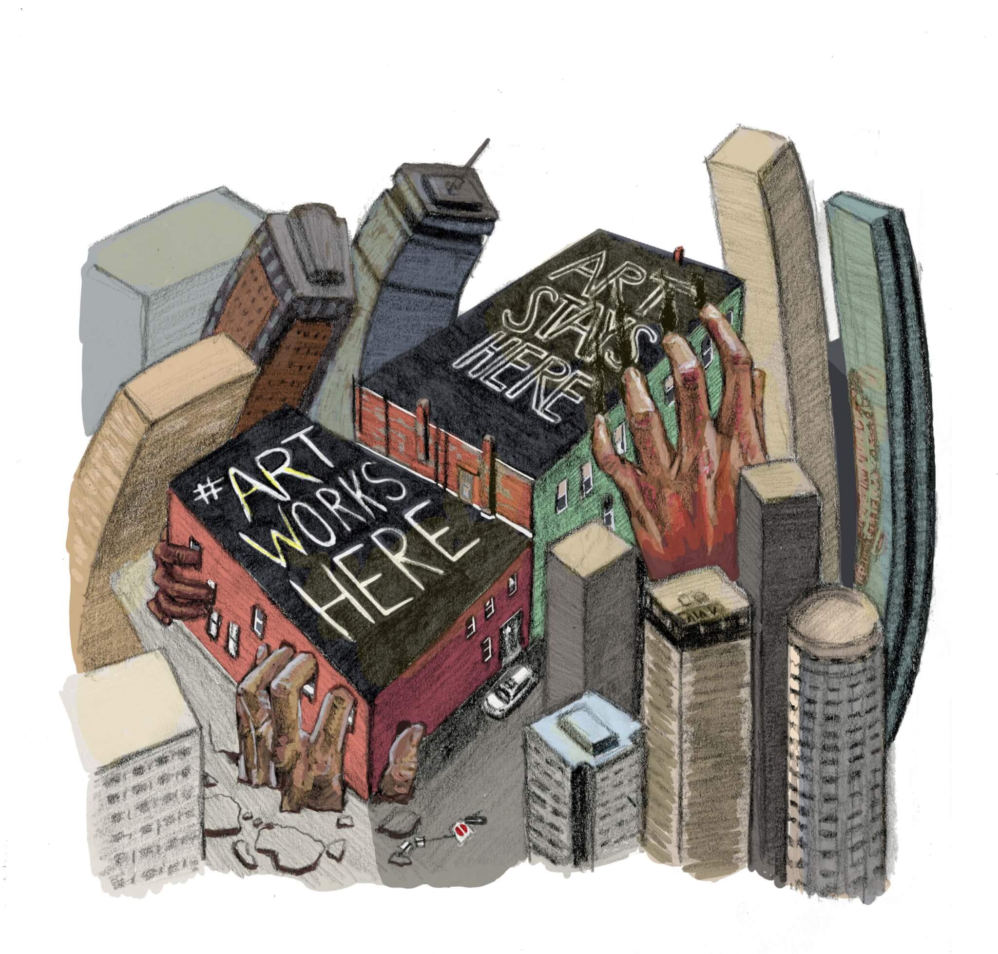 “We coined that word—#ARTSTAYSHERE—and we had signs up on our building,” said Cristina Todesco, a stage designer on the steering committee at Humphreys Street Studios. “We put a sign on our roof, all in hopes to let people know what was going on, that more artists were going to be leaving our city. It’s just too expensive. That was a way that we could telegraph what was happening.”