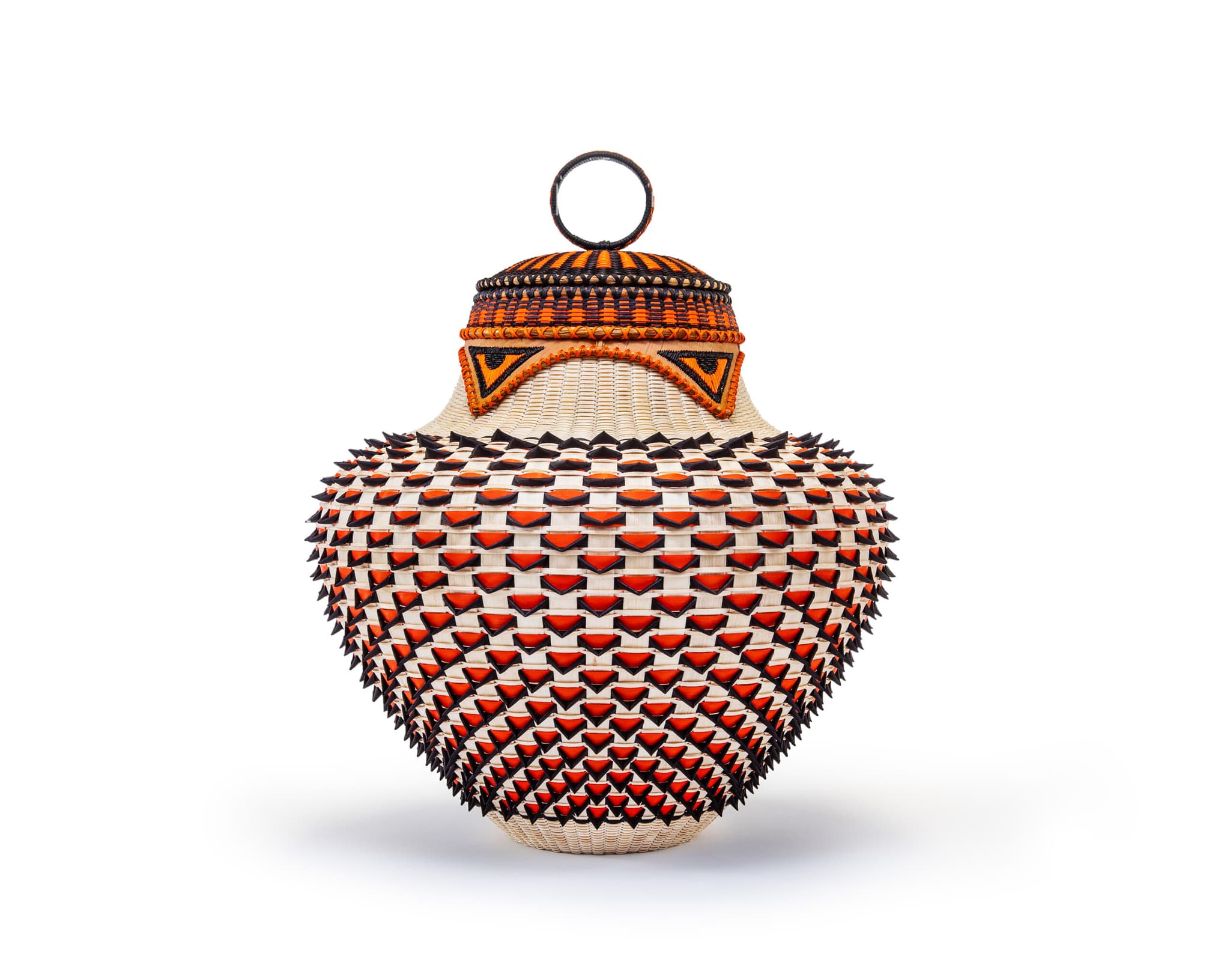 The basket speaks to Frey’s interest in creating something new within the boundaries of an ancestral craft. He emphasizes how his baskets build upon a lineage of invention passed down through an intergenerational transfer of knowledge—many individual basketmakers have added to a legacy of somatic movement and process.