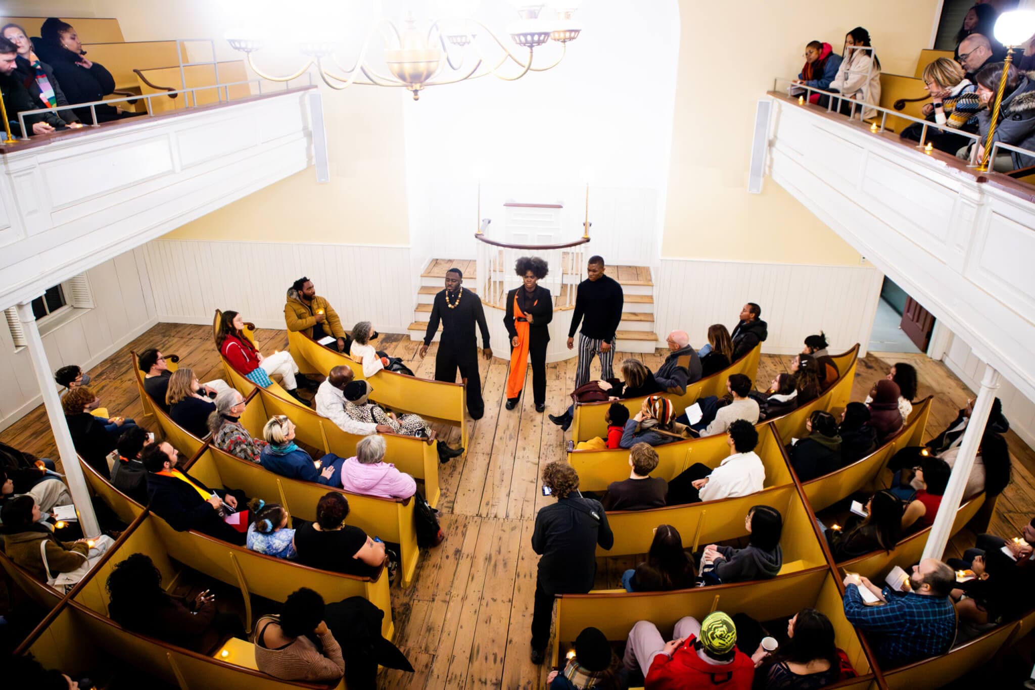 Performance view of Jonathan González with Ogechi Okoye, Ifeanyi Epum, Valentine Umeh, suite for a minor meeting, February 28, 2026, African Meeting House, Museum of African American History and Tufts University Art Galleries. Photo by Cat Lent.