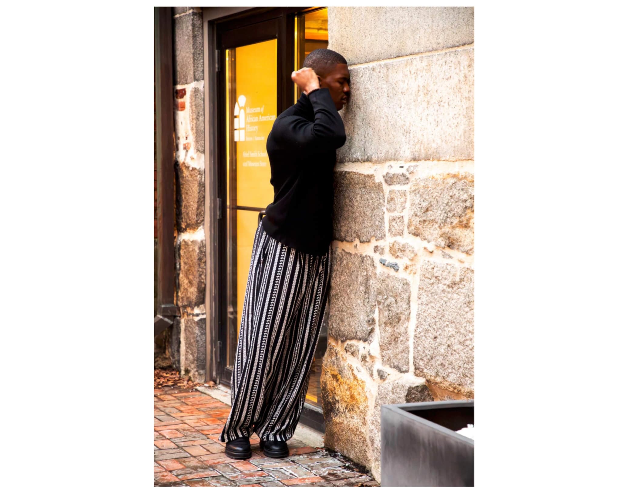 At the start of Gamin, members of the audience could rarely see all three performers at once around the edges of the African Meeting House. Each performer stood at a different position, distanced from the others, performing independent choreography while exploring the surrounding streets. Audience members could catch varying glimpses of each performer or opt to focus their attention on one for the duration of the performance. I focused my eyes on Umeh, the first person in my line of sight, as he solemnly traced his fingers across the building’s exterior, pressing his ear to the stone wall and pounding on it with a tight fist. At times, he moved suddenly, as if in fear—what was he anticipating? It seemed as if phantoms were ushering him to listen to the building itself. I could not see Epum and Okoye, but I could hear the distant sliding and stomping of their feet on the pavement. At the TUAG panel, González mentioned that the performers referenced the story of Mrs. Dorsey, a formerly enslaved woman who took shelter in the house. The title of Augusta Savage’s Gamin is a French term for a streetwise child, or “street urchin.” To be streetwise was to be constantly alert, cautious of one’s surroundings. Umeh’s frantic movements, then, performed Mrs. Dorsey’s own necessary street smarts to evade being captured.