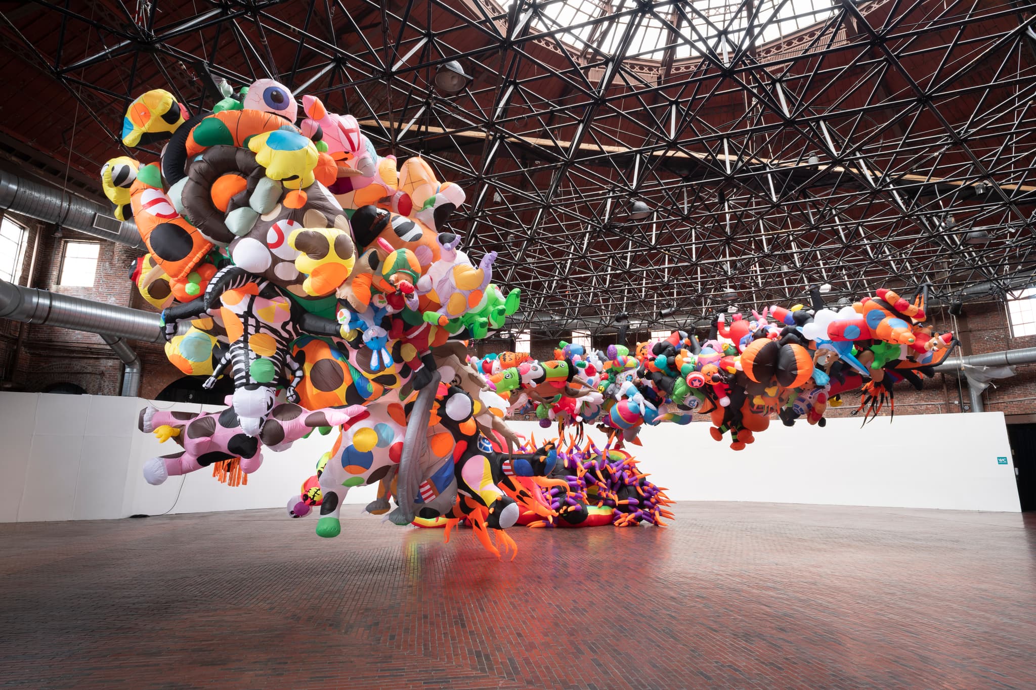 Nick Cave: For the last decade my work has really been very much focused on looking at gun violence within our culture. I sort of came to this conclusion with that work, and I wanted to then go forward with the work being about happiness—or what we think that is. So then I was sort of questioning, what does that mean? What does that look like? It led me to think about the holidays. We go into the holidays with great intentions, and yet for a lot of people it becomes this destruction. It just falls apart. But how do we still find ways to find the positive, to hold it together? So “Augment” came out of that. I decided to look at all the holiday inflatables as a source material. I wanted to take all of those, cut them up, and sew them all back together. “Augment” is sort of taking parts and pieces of something and making it greater. And so then I just made these outrageous, insane inflatables that are just crazy, exciting, and fun and interesting and disturbing and colorful.