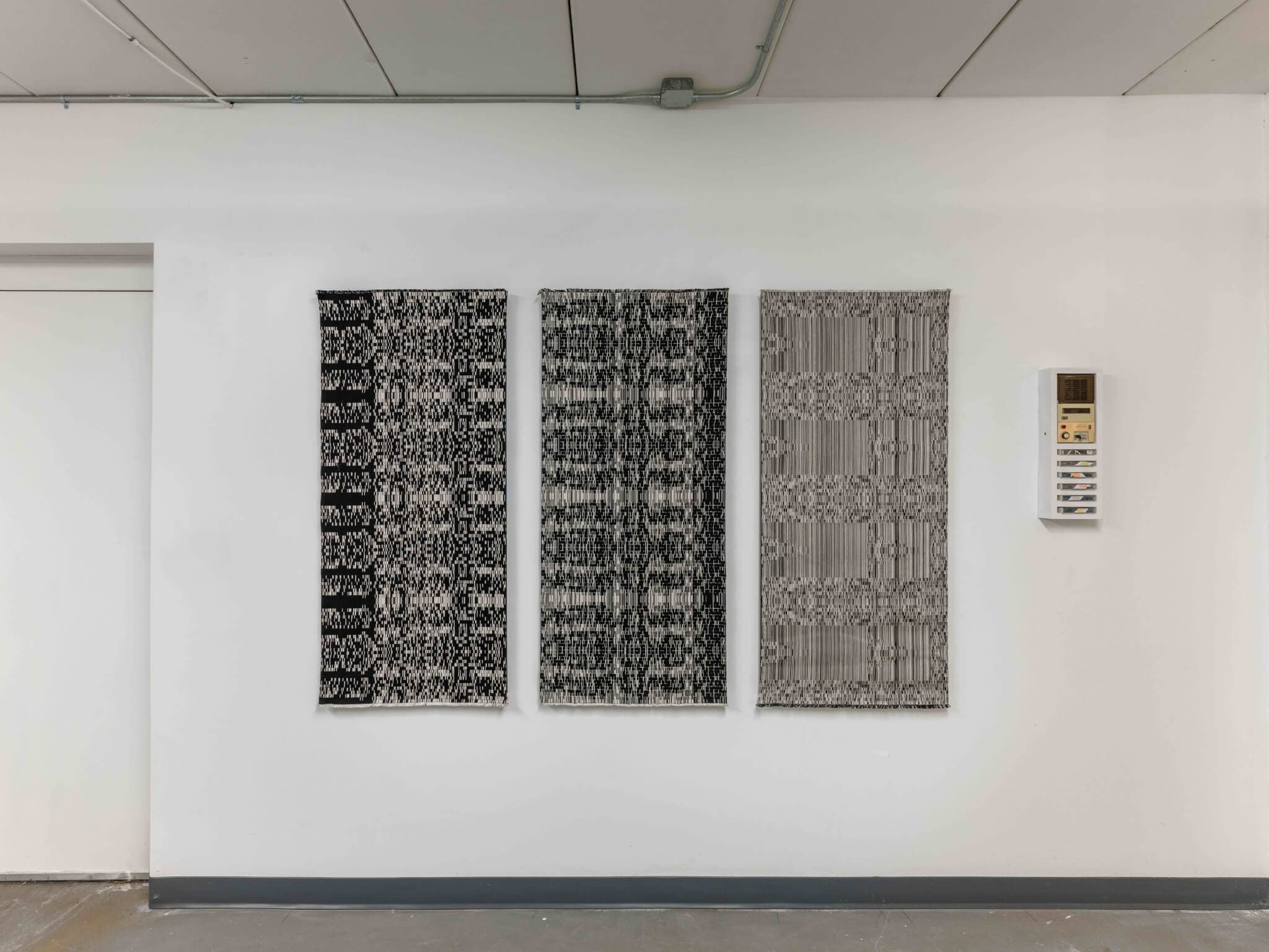 Jungil Hong, Bit Map, 2015. Jacquard and mixed media. Various dimensions. Installation view, “The Time Being,” ODD-KIN in East Providence, RI, 2024. Courtesy of ODD-KIN. Courtesy of ODD-KIN.