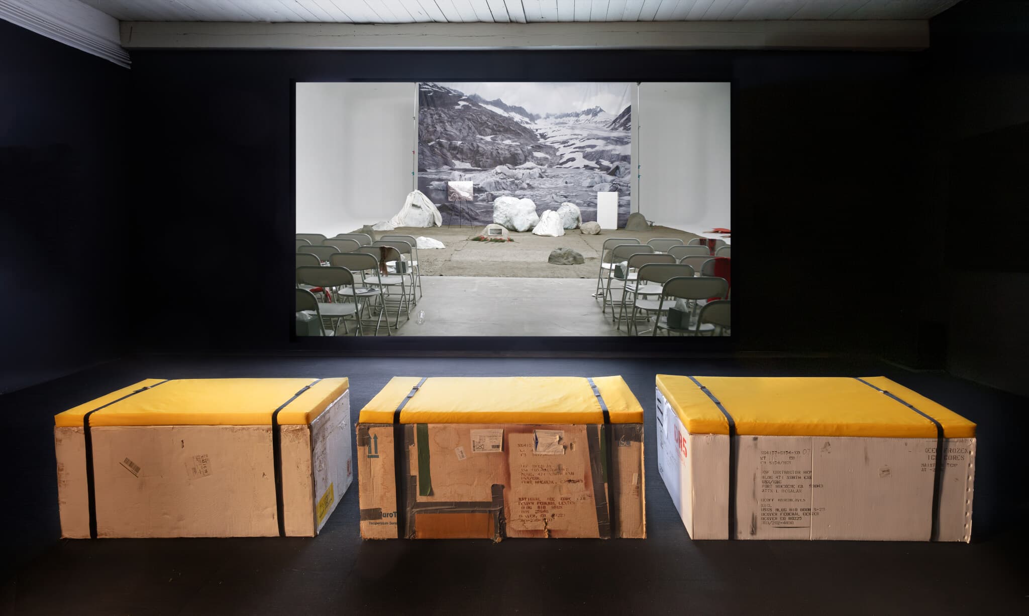Ohan Breiding’s exhibition “Belly of a Glacier,” on view at MASS MoCA and co-organized with Williams College Museum of Art, explores what it means to lose ice through photography, drawings, and an experimental documentary. The film, also titled Belly of a Glacier, is a thirty-three-minute documentary-turned-fever-dream about the slow death of Switzerland’s Rhône Glacier. Breiding, effectively uses the documentary format to connect the physical impacts of climate change with the abstract, surreal feelings of ecological grief. The film moves through ice core drill and storage sites, lava flows, cattle grazing and giving birth, sweeping views of the Alpine landscape, the glacier melting in midday sun, and archival footage, and ends with scenes from a speculative funeral for the Rhône Glacier in the year 2050, its anticipated year of death. It also follows the residents of Obergoms, the quiet, baroque Alpine village nearest to the glacier, as they cover the ice body with five acres of thermal blankets in an attempt to insulate the ecosystem from rising temperatures. The film is compelling yet dreamy; red filters and expert editing push right up to the edge of cerebral horror.