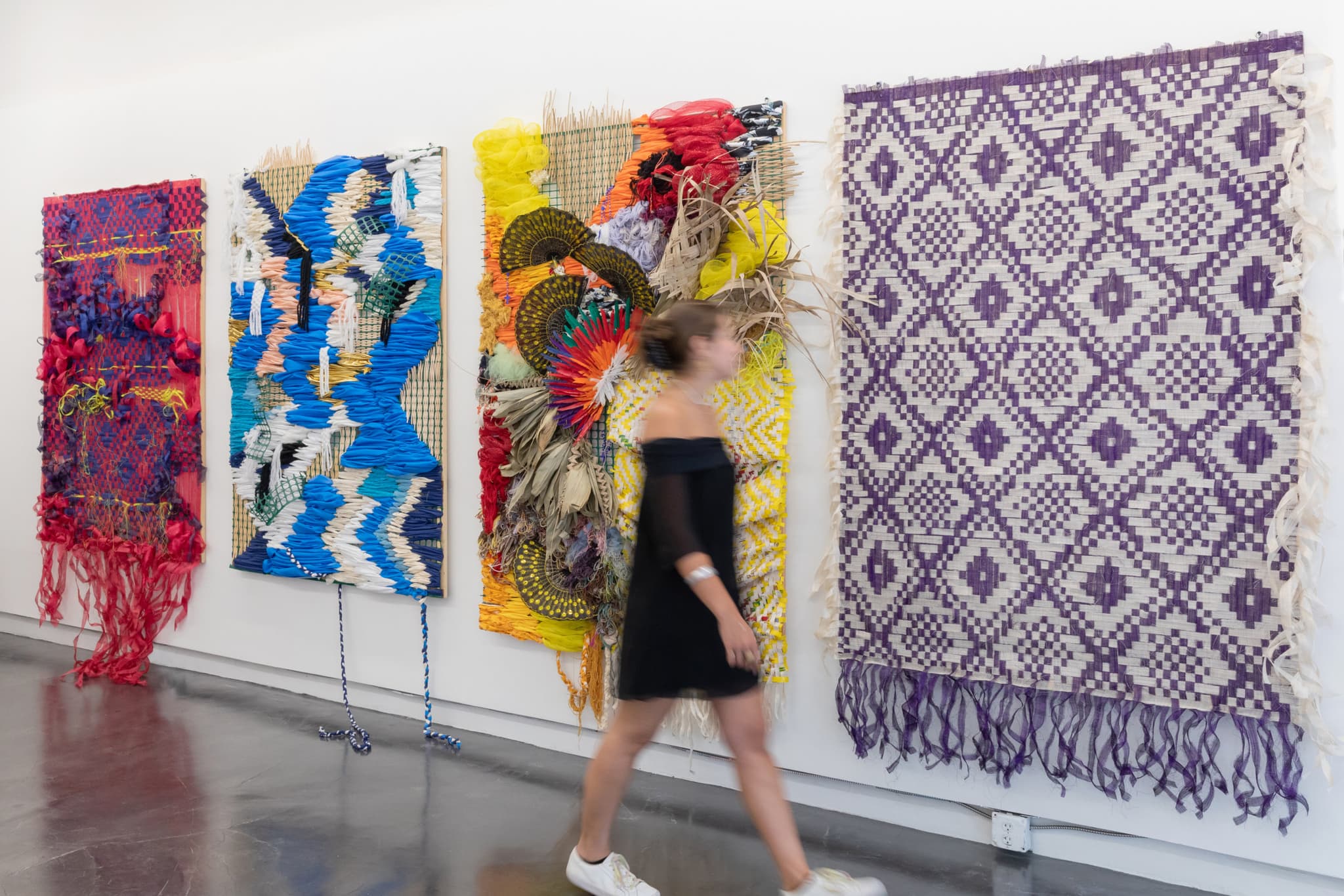 The push and pull between legibility and illegibility, exposure and evasion, may be most apparent through performance, but is also eloquently expressed in his weavings, which range from the resplendent blues and glossy golds of Mermaid’s Tail (2022) to the restful geometries of Midday Landscape in the Orient (2022), which is solely composed of rattan woven through stretched industrial plastic fence.