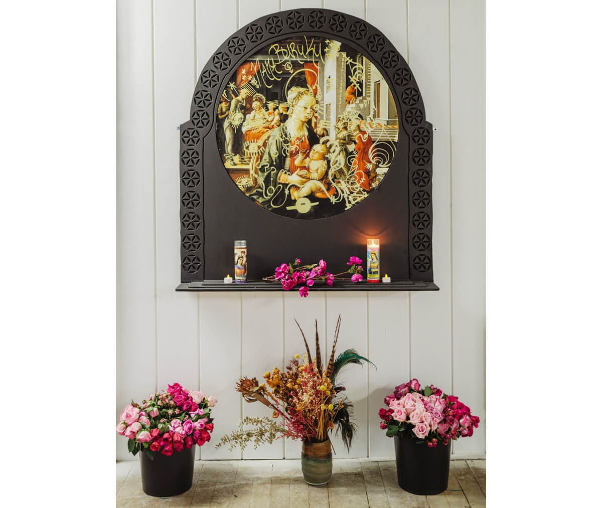 Morales’s transporting video of a ritual return to the ocean in Back to the Womb of the Mother plays next to a shelter lovingly adorned with petals and shells: come, rest, return. Eid’s photographs of diaspora and ritual are stunning—I am transfixed by the color, clarity, and thematic contrasts of her work. Her video Rooted Revelations offers sensory gifts: sun catchers intercut with rolled grape leaves and crystal bells, to be enjoyed while seated on satin-cushioned milk crates. Prayers to Nana Buruku altar holds court—she insists on presence in the face of suppression.
