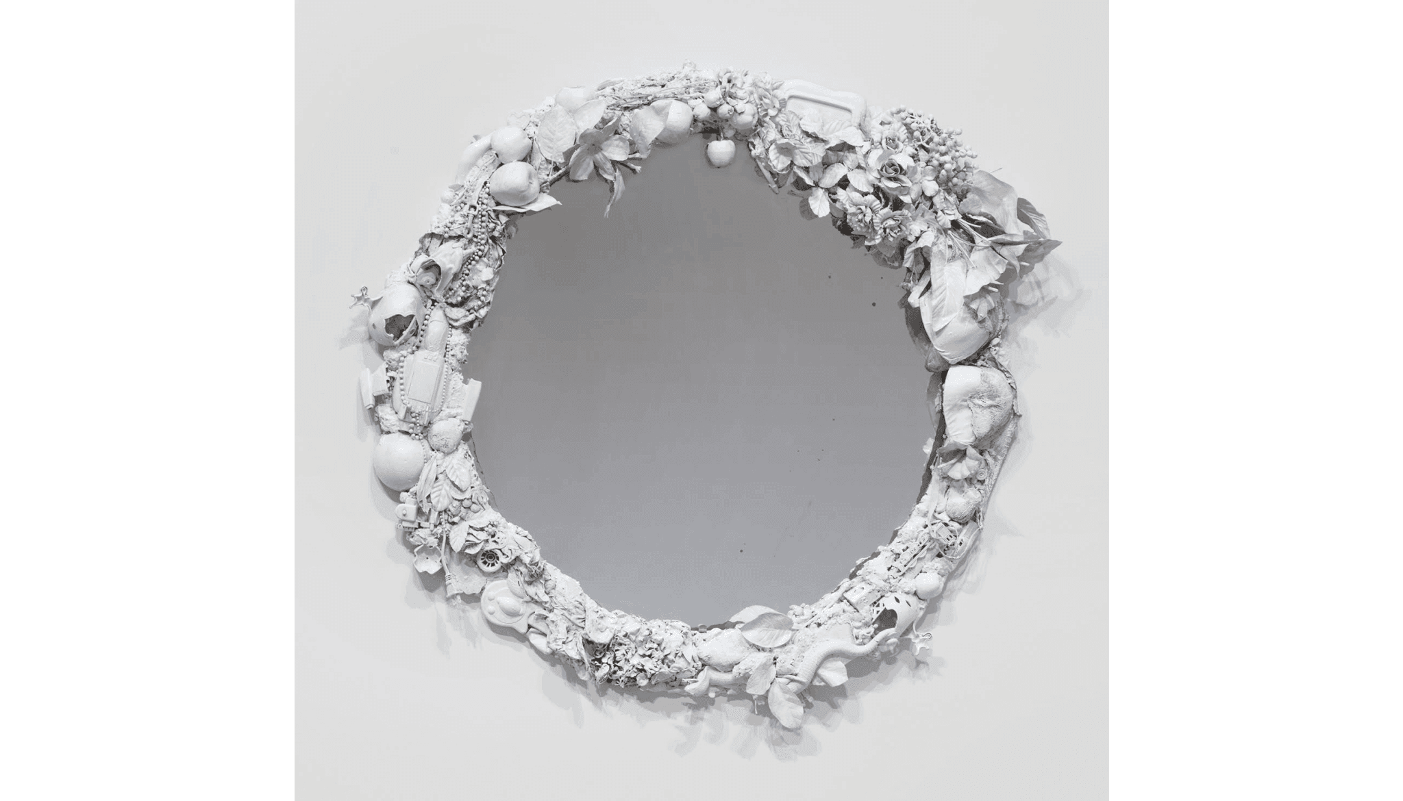 Sarah Meyers Brent, Vanitas, 2022. Repurposed items, acrylic, mirror, and wood. 43’ x 46’. Photo courtesy of Chase Young Gallery.