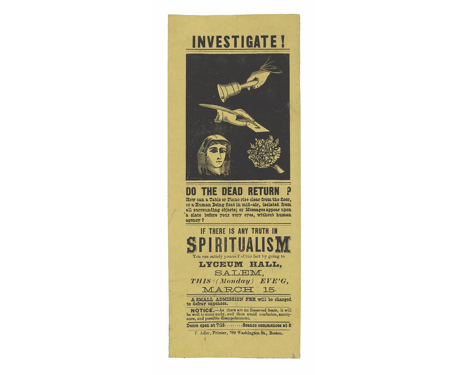 F. Adler, Investigate!: Do the Dead Return?, Broadside, Boston, circa 1881. Image courtesy of Phillips Library, Peabody Essex Museum.