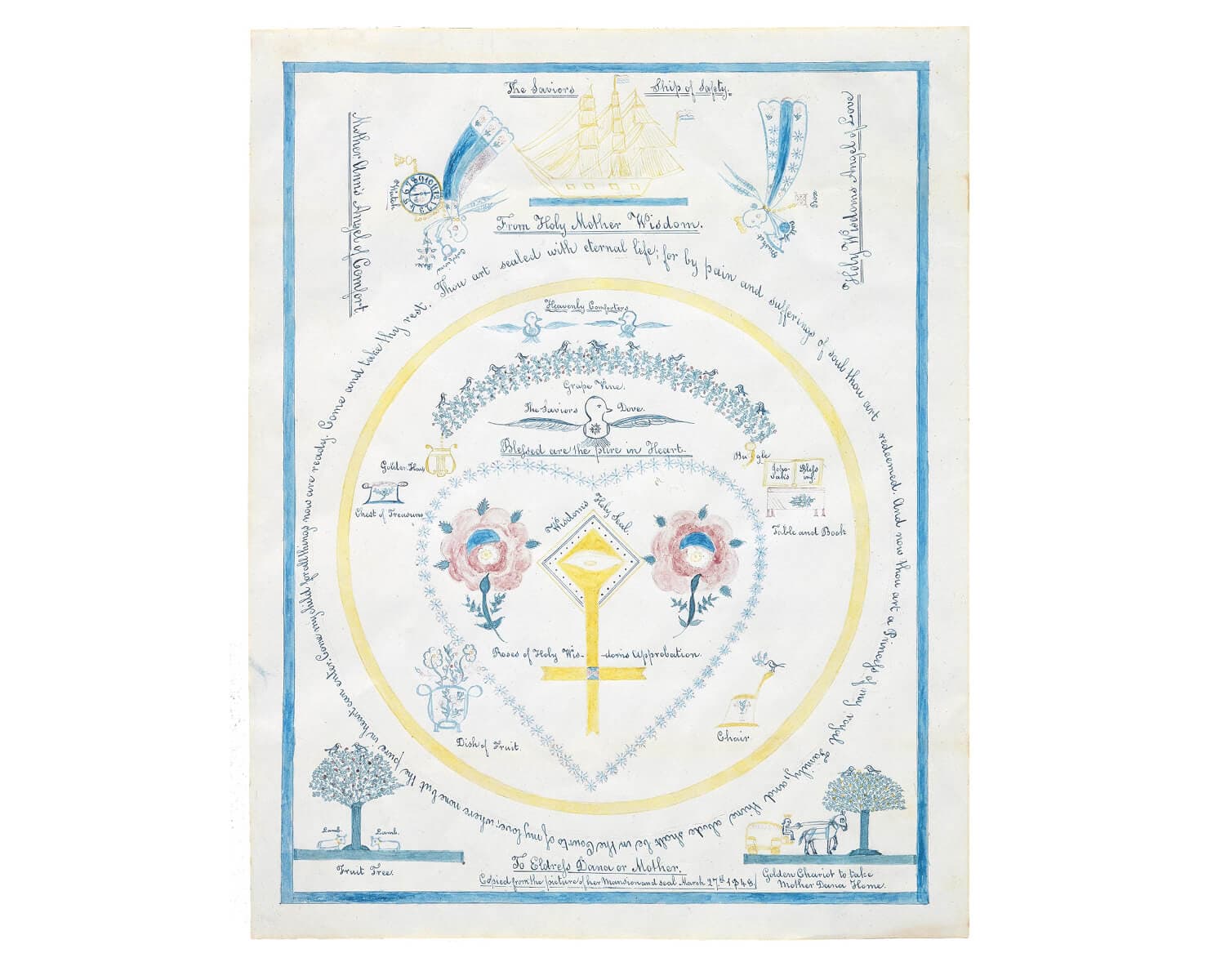 Miranda Barber, Holy Mother Wisdom… To Eldress Dana or Mother, 1848. Ink and watercolor. Approximately 10 x 8 inches. Courtesy of Hancock Shaker Village.
