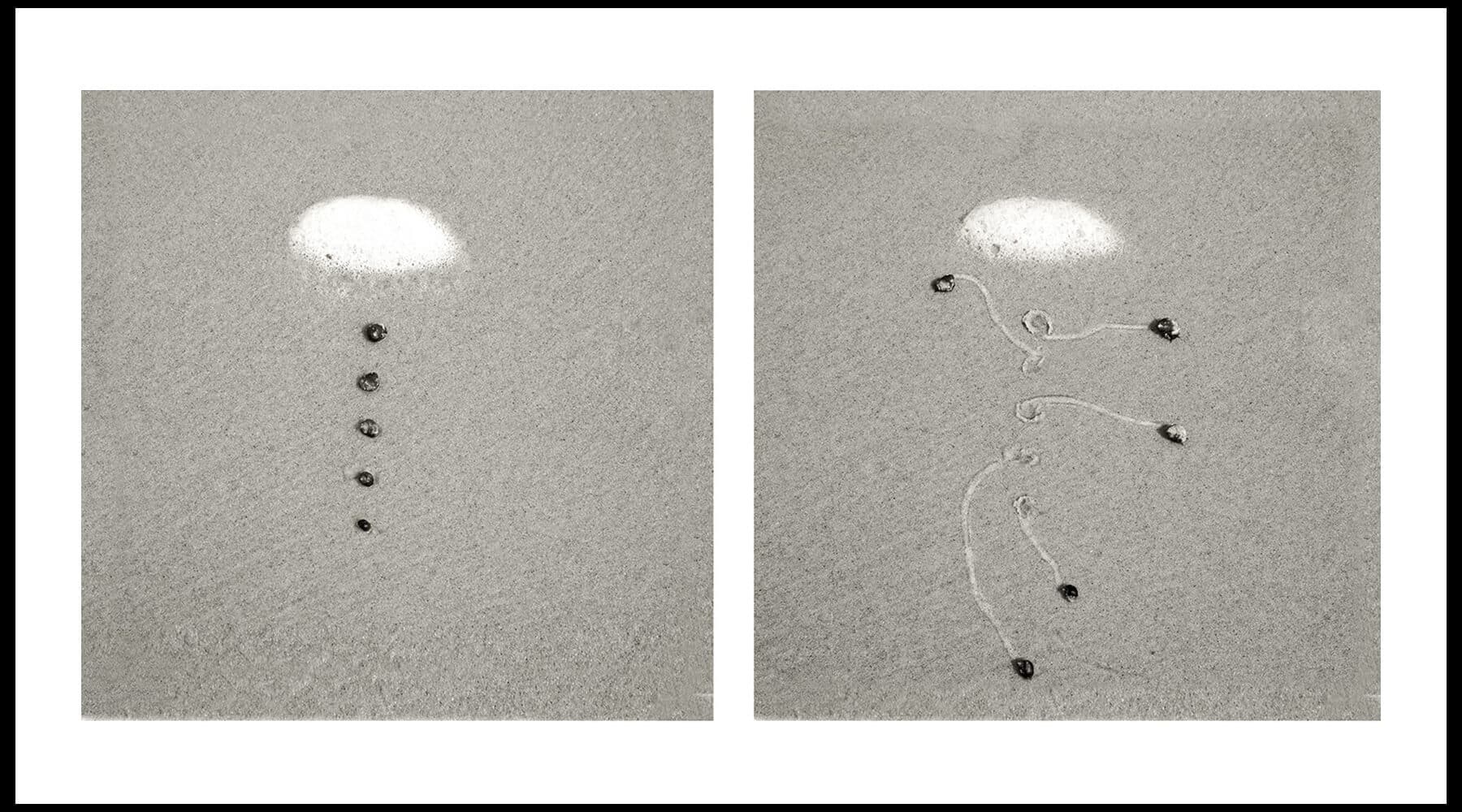 Snails are not often the subjects of fine art; artists who depict the natural world are typically drawn to nobler, or at least less slimy, species. But for Daniel Ranalli, a photographer and environmental artist whose work is currently on display at LaMontagne Gallery in South Boston, these unassuming gastropods are not only worthy artistic subjects, but also creative collaborators.  The show, “Snail Drawings,” consists of a collection of photographic diptychs that depict the movement of snails on a beach. In the first image of each set, we see the snails in the careful configuration in which they have been placed by the artist; in the second image, taken twenty to thirty minutes later, the snails have crawled out of their original formation, leaving trails imprinted on the sand behind them. The photographs are small—each individual picture is about a square foot—and shot in black and white. They span several decades: Ranalli first came up with the idea for the series thirty years ago, while taking pictures of snail tracks on Cape Cod beaches at low tide. Soon, he began to arrange the snails himself, influencing—though not controlling—his subjects’ movements. “I am like a choreographer,” he says in a quote in the show’s press release, “whose dancers pay me no attention.”