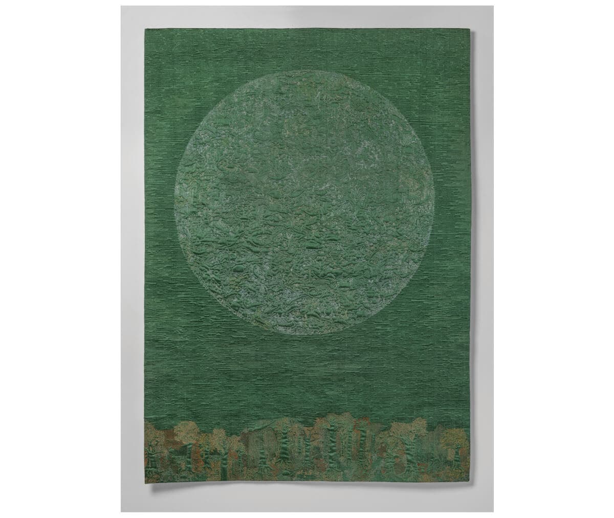 Brienne Brown, Spring Moon, 2024. Dupioni silk, cotton batting, linen backing, cotton and silk threads, 51” × 36.5”. Photo courtesy of Gallery NAGA.
