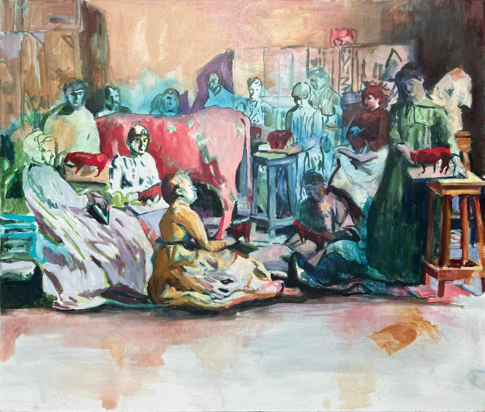 You might know Coral Woodbury from her Revised Edition series, which has her painting 617 sumi-ink portraits of women artists onto pages pulled from Janson’s History of Art, a tome that completely omitted women from its first twenty-nine printings. Research for that ambitious ongoing project helped inspire the new oil paintings in this solo exhibition, which likewise aim to prod at the Western canon and shake out untold stories of women in art. One painting imagines a class of nineteenth-century sculptors using a cow as their muse at a time when women were forbidden from viewing nude models. Another envisions a meeting between Victorine Meurent (herself an accomplished painter) and Suzon, two of Manet’s favorite models, as they dish on their employer. I’m excited to see what else Woodbury has in store as she brings her wit and scholarship to wider canvases in full color.