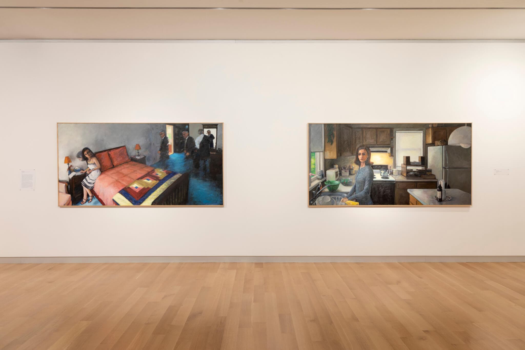 (left) Wen-ti Tsen, Concord, NH #6: Sylva and Farid, 2015. (right) Concord, NH #3: Sylva, 2008. Both oil on canvas. 48 x 96 inches. Installation view, “GENERATIONS,” MassArt Art Museum, Boston, 2025. Photo by Mel Taing. Courtesy of MassArt Art Museum.