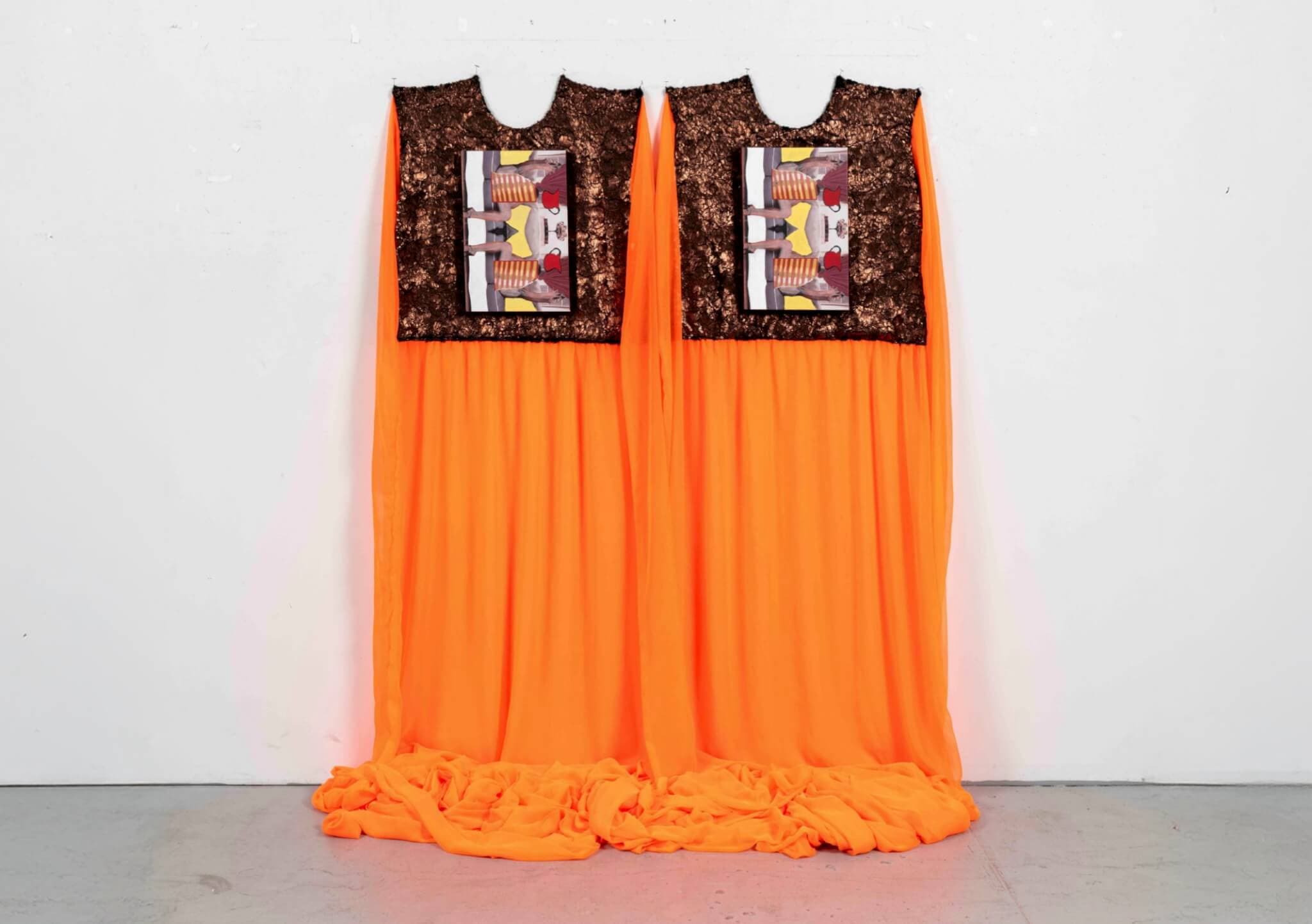 Beverly Semmes, Flip, 2024. Faux fur, chiffon, acrylic over photograph printed on canvas. 81 x 67 x 23 inches. Photo by Jason Mandella. Copyright the artist. Courtesy of the artist and Susan Inglett Gallery, NYC.
