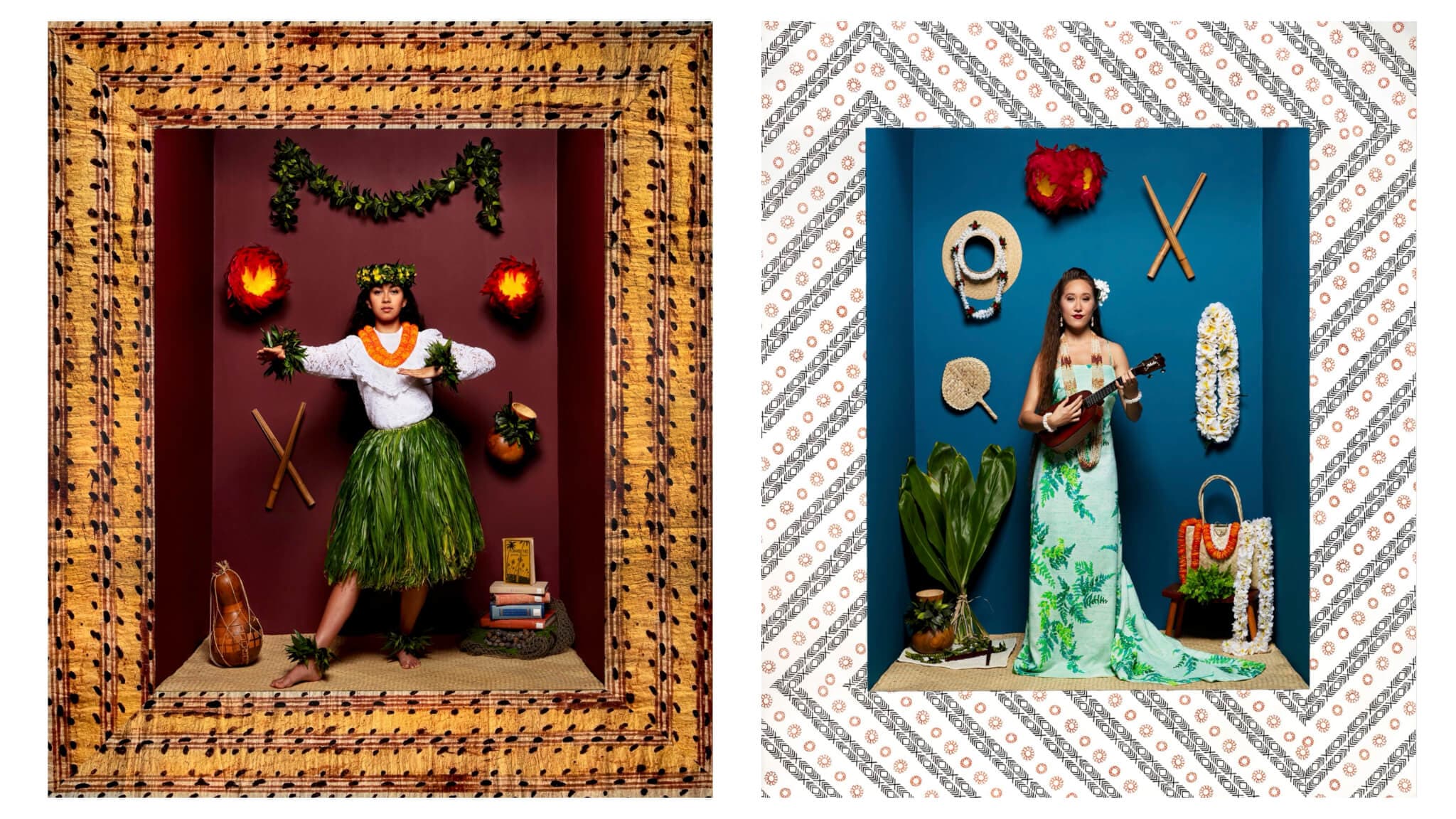 (left) Cara Romero (Chemehuevi/ American, born 1977), Amedée, 2024. Archival pigment print. 50 1/8 × 43 1/16 inches. (right) Kaitlyn, 2024. Archival pigment print. 50 7/8 × 43 1/16 inches. Courtesy of the artist.