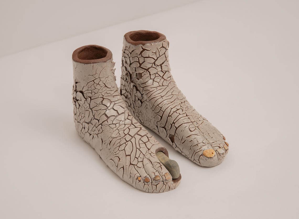Elizabeth Atterbury, Second Feet (Molting), detail, 2025. Ceramic, glaze, shells, rock. 9 ¾ x 6 x 3 inches each. Photo by Boru O’Brien O’Connell. Courtesy of Center for Maine Contemporary Art.