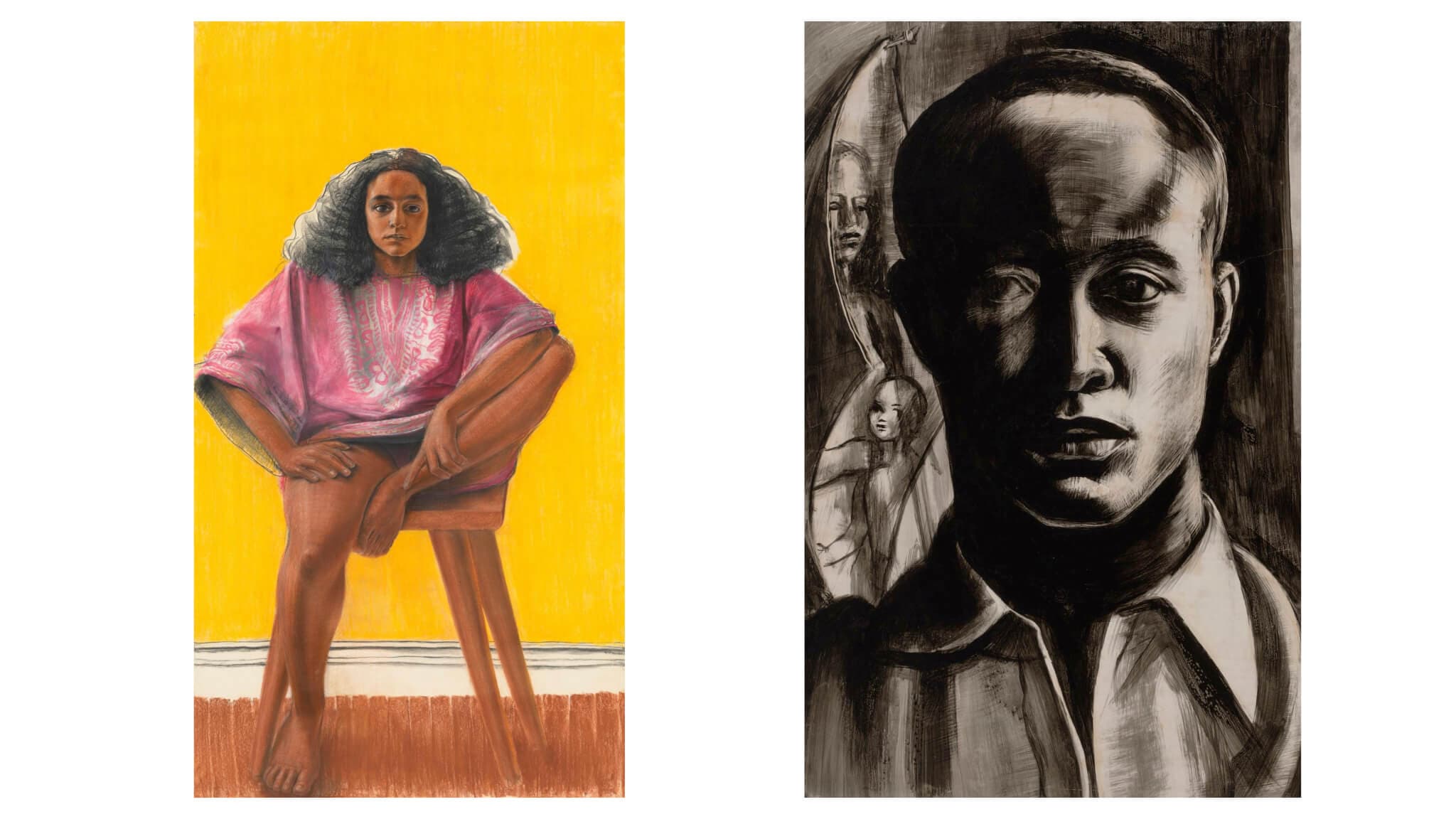 (left) John Wilson, The Young Americans: Gabrielle, 1975. Colored crayon and charcoal on paper. National Gallery of Art, Washington, D.C. (right) John Wilson, Self-Portrait, 1946. India ink on paper, mounted on laminated paper board. Emily L. Ainsley Fund. © Estate of John Wilson. Photograph © Museum of Fine Arts, Boston.