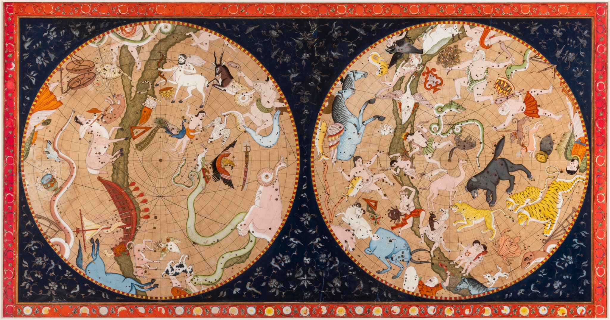 Star map depicting the northern and southern celestial hemispheres (with constellations inscribed in Devanagari). India, Jaipur, ca. 1780. Ink, opaque watercolor, and gold on paper. Pritzker Collection, Chicago. Photo: Michael Tropea.