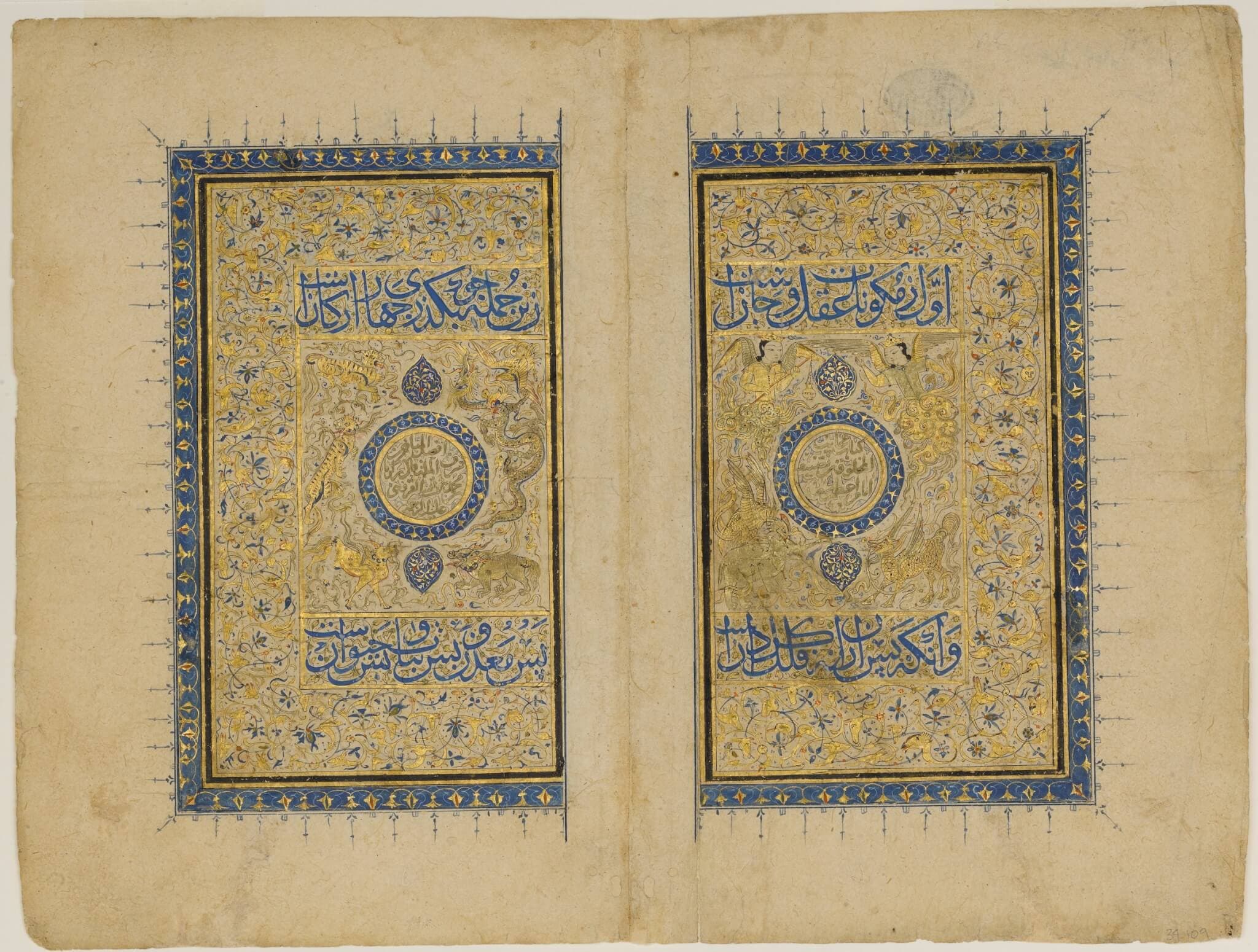 Double frontispiece, bifolio from a manuscript of The Wonders of Creation and the Rarities of Existence. Iran, Shiraz, 823 ah (1421). Ink, opaque watercolor, and gold on paper. The Metropolitan Museum of Art, Fletcher Fund, 1934, 34.109.